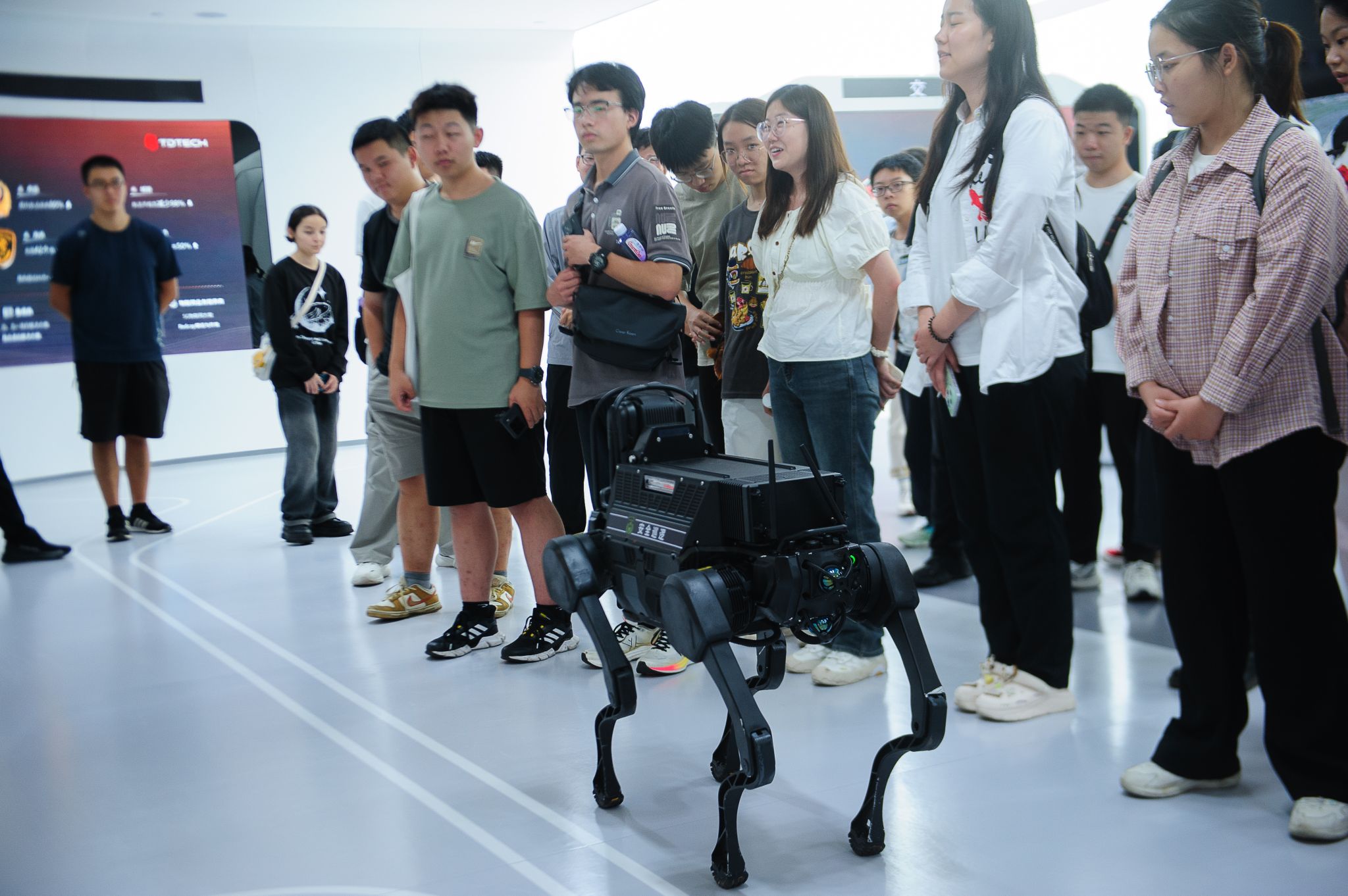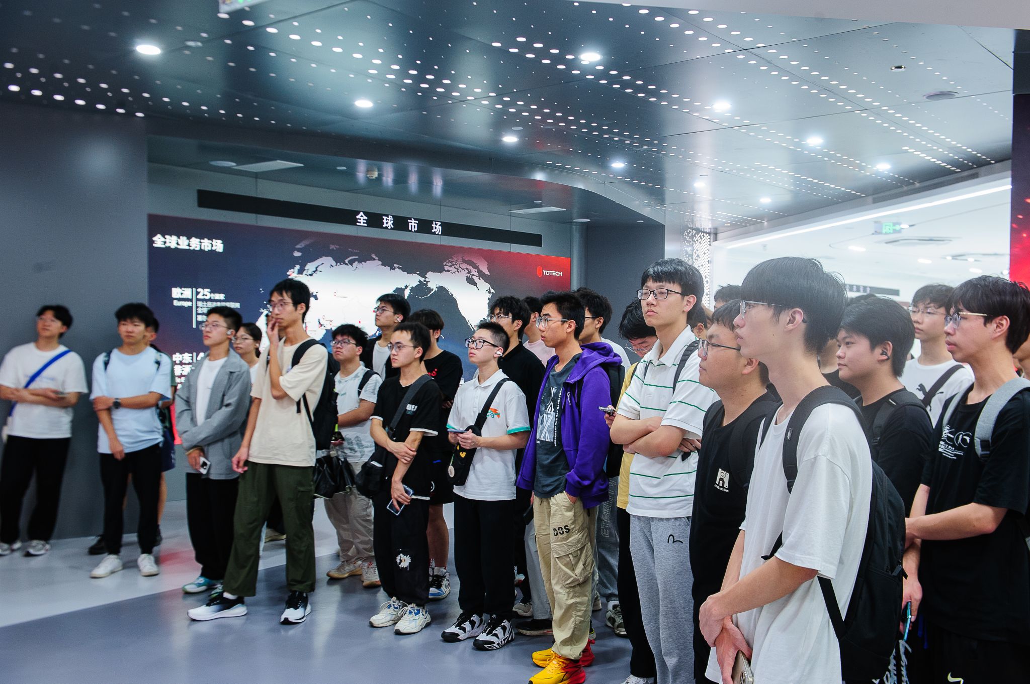 活动伊始,同学们首先参观了鼎桥公司展厅,在讲解员的带领下详细了解了企业发展里程、业务领域、核心技术、研发成果及行业成就,并近距离观察了企业自主研发的核心设备、解决方案及落地的行业案例。展厅内的实物展示与图文讲解相结合,让同学们对鼎桥技术的实力与行业地位有了直观且深刻的认识。