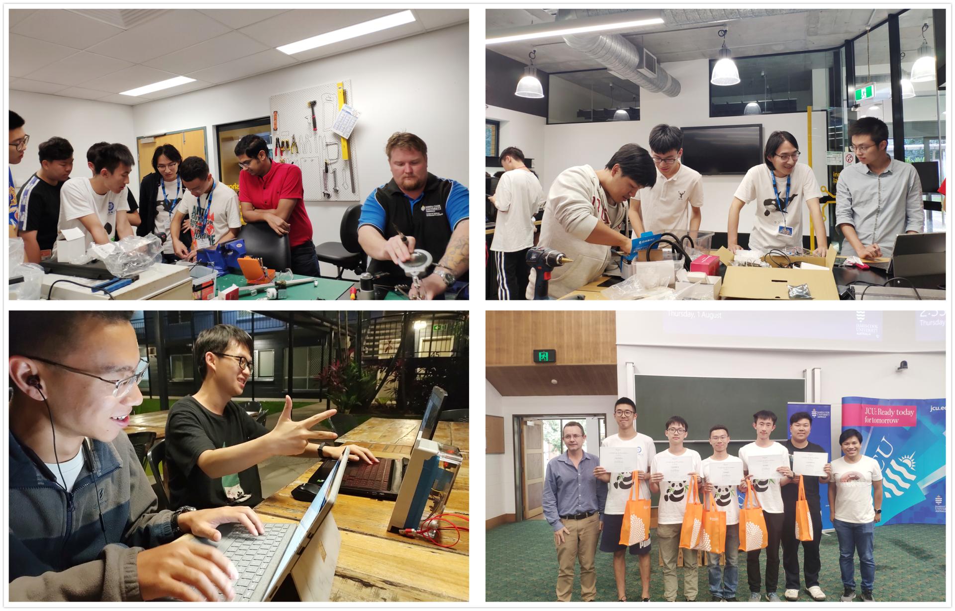 交流团在澳大利亚的一项重要任务就是进行智慧物联项目的学习,在JCU-IoT实验室,来自JCU的Eric Wang博士给同学们带来了详细的介绍与指导,在研究项目的两周中,同学们逐渐熟悉项目,一步步将理论转化为实践,成功设计出了雨林夜间拍照系统和温度湿度监测系统。最终各小组通过全英文答辩和项目实物展示的方式,将团队项目成果展现给了同学们和老师们,受到了来自JCU老师的一致称赞,行程最后一天JCU向维教授向每一位同学们颁发了结业证书并对优秀队伍进行了嘉奖表彰。在项目进行的同时,同学们还深入JCU校园,参加公司户外午宴,在图书馆与JCU同学一起探讨问题,很好的展现了成电学子求实求真,大气大为的风采。