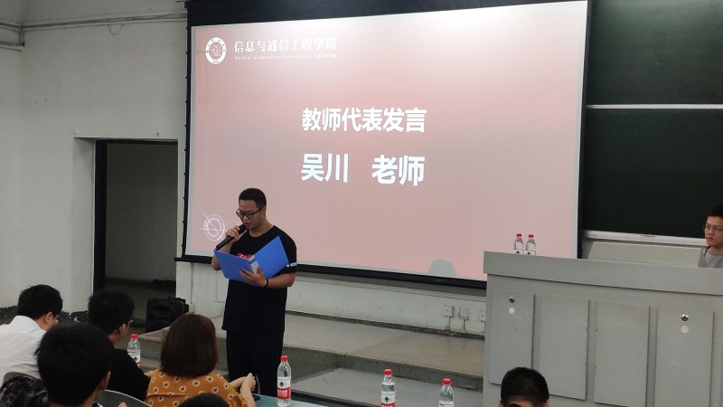 吴川老师代表公司全体教师发言,他希望同学们不负众望,从自身做起,从现在做起,学会做人、学会做事、学会生活、学会学习、学会合作。希望同学们明白大学的学习意义重大,学习生活是朴实的、平凡的、甚至是艰辛的。希望各位同学在未来的日子里努力学习,有趣生活。