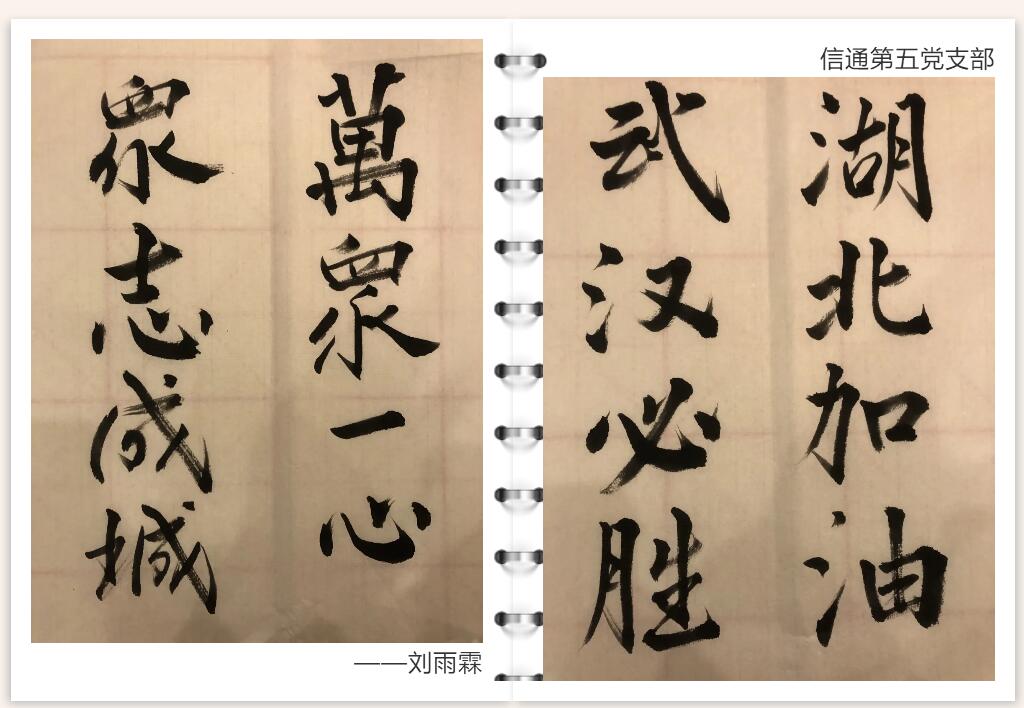 青年是祖国的未来、民族的希望。高校员工是可爱、可信、可为的一代。疫情当前,公司本科第五党支部积极响应号召,投身疫情防控阻击战。党员们或是在自己的家乡,协助当地有关部门完成群防群控任务,最大限度切断病毒传播途径;或是用文字、书法的方式书写点滴感悟,为武汉加油,为中国加油!