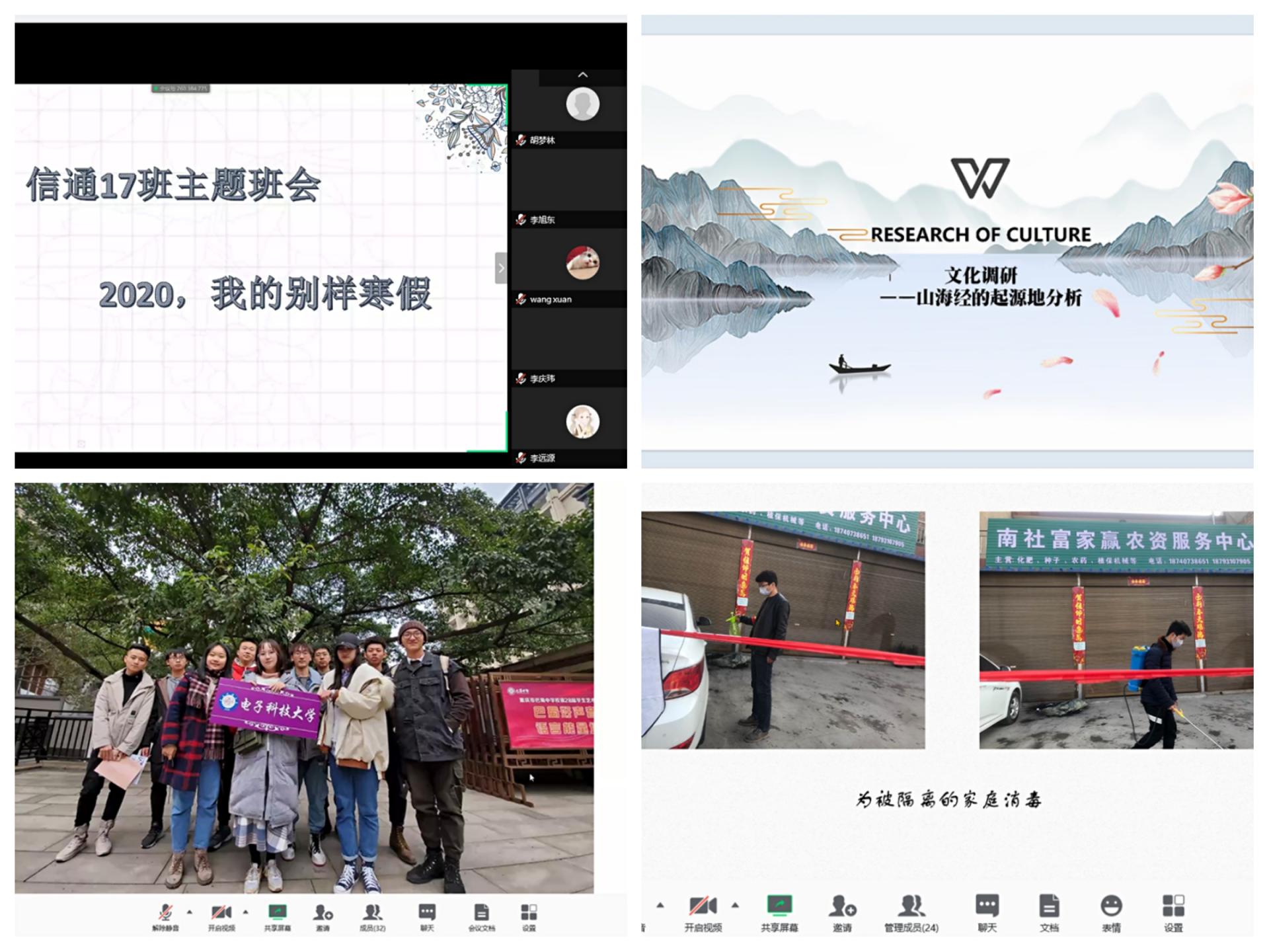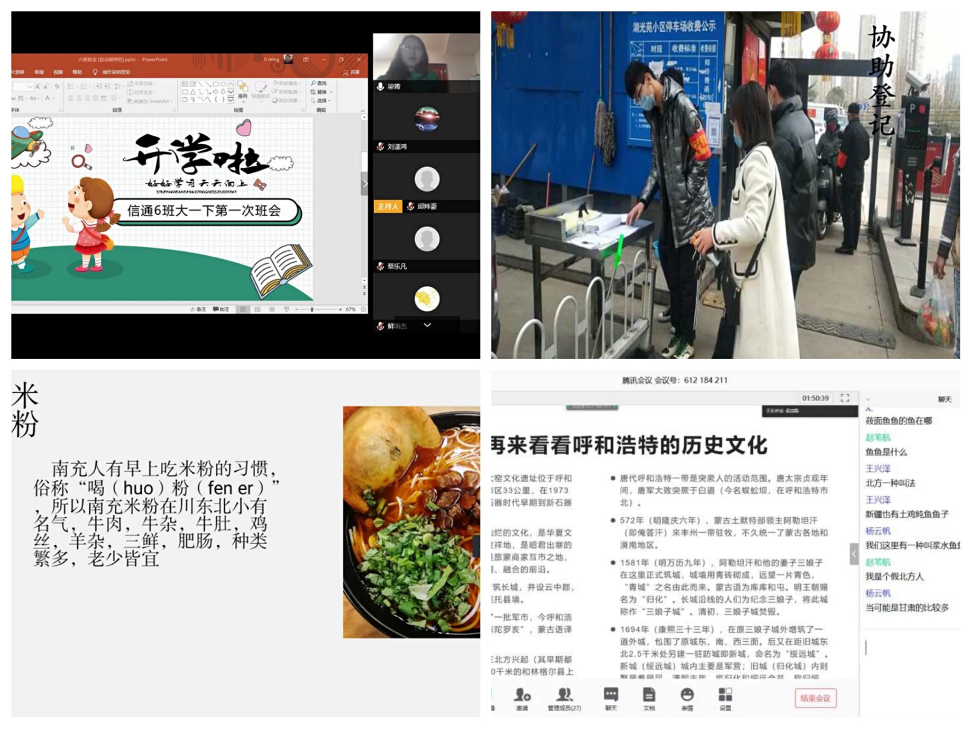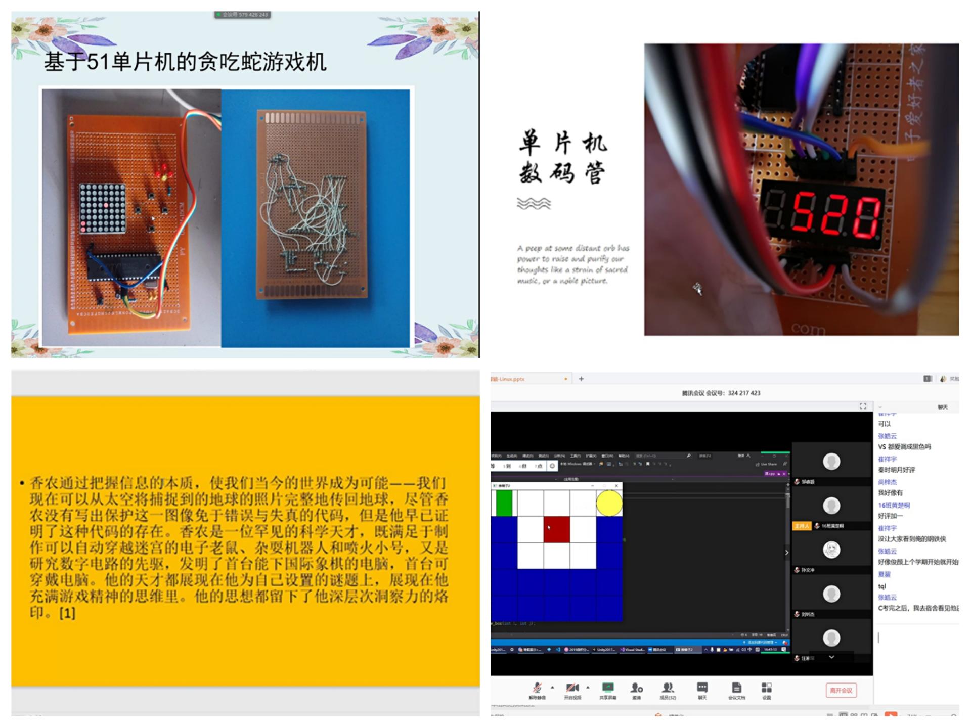 班会展示推选阶段,年级19个班线上召开主题班会,邀请辅导员、班主任老师共同参与。全年级员工百分百参与,在线上进行3-5分钟的PPT展示,向老师和同学们分享自己的成果和收获。“学科探索”模块,有的同学运用单片机实现了“Flappy Bird”游戏;有的同学用编程软件升级了推箱子、贪吃蛇、五子棋等趣味游戏编程;有的同学给大家分享了自己阅读信通学科科普读物的感受,给班级同学分享了自己对学科的理解和认知。“文化调研”模块,有的同学从历史、人文和发展等角度介绍自己家乡;有的同学展示自己挺身而出,投身志愿队伍,为抗击疫情贡献自己的力量;有的同学分享坚持早起、记忆单词,积极备考六级;有的化身父母的“贴心小棉袄”,利用短视频平台学习烹饪,为家人增添了欢声笑语。全国各地的同学们利用网络汇聚一堂,展示自己的多彩居家学习生活,让同学们大开眼界,增进了同窗情谊,提高了班级凝聚力。