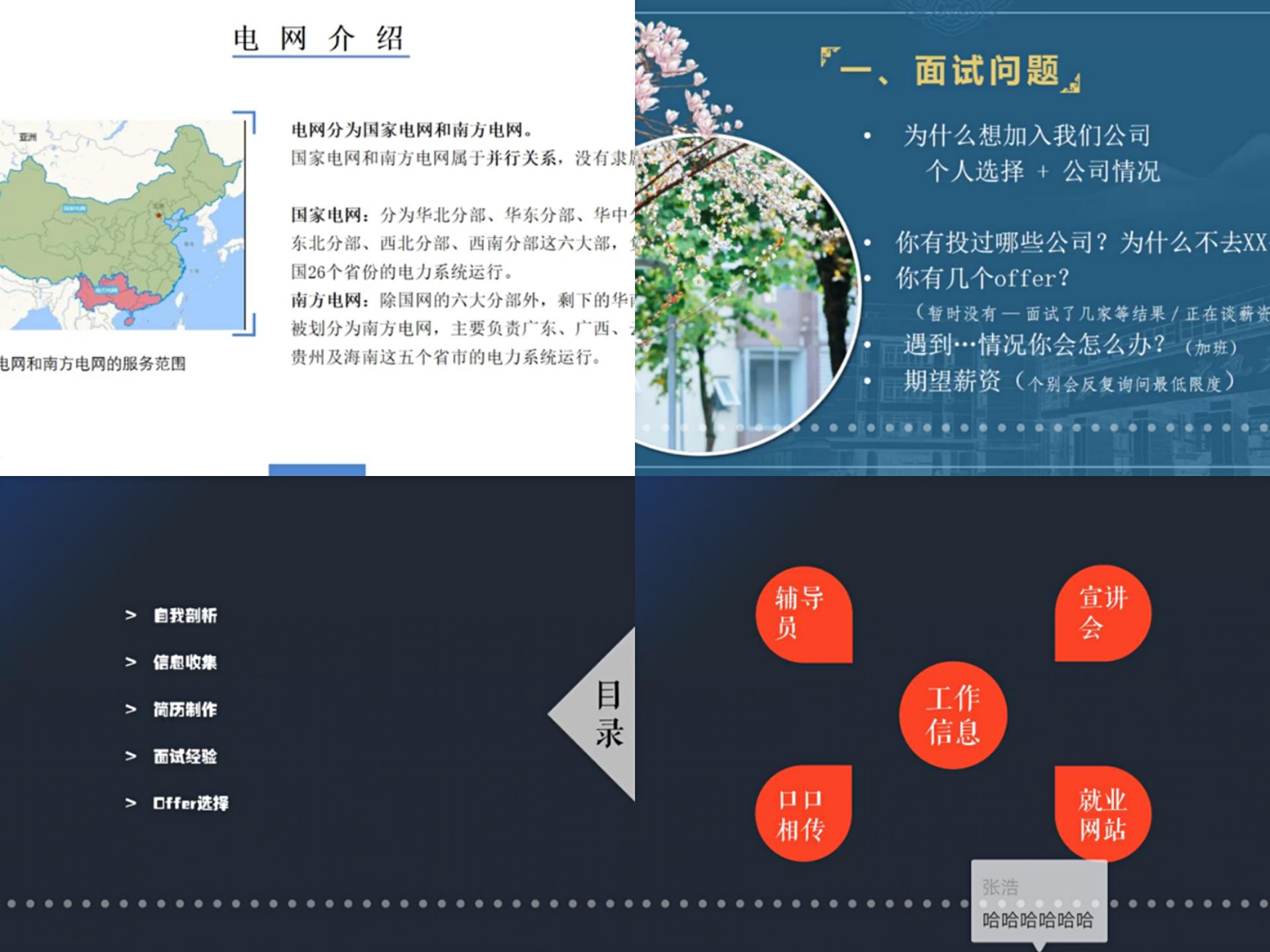 陈秋敏师姐从国网的招聘大纲开始讲起,详细介绍了不同省份国网招聘的不同要求。师姐向大家分享了自己参与国网提前批招聘的求职经验。最后,她鼓励大家提前了解用人单位的现状和未来发展,为今后的职业选择做好准备。鲍俊玲师姐为大家介绍了许继集团的基本情况。师姐从自身为何选择国有企业出发,建议同学们提前做好准备。同时她还透露许继集团近年来招聘女生较多,希望学妹们积极尝试。接下来的舒培师兄和何旬师姐主要从求职过程中的笔试和面试经历给大家分享经验。两位师兄师姐还给大家分享了一些个人见闻和笔试面试技巧。王林翰师兄则主要从着手找工作到最后收到offer的整个过程进行梳理,给出自己的中肯意见和建议。他鼓励线上的各位同学相信自己的实力,不卑不亢,双向选择。