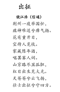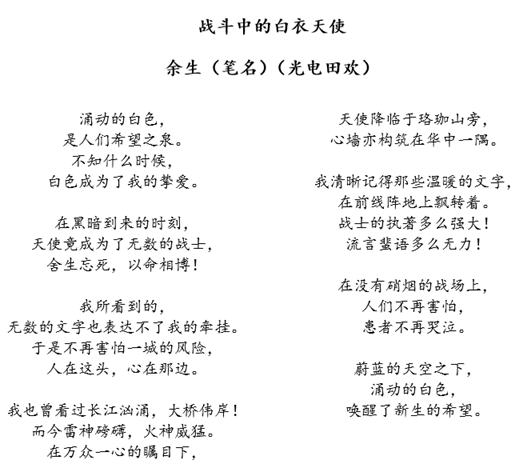 这首诗以叙述的形式展开,记叙了疫情从爆发到各地驰援的过程,用词慷慨激昂,振奋人心。