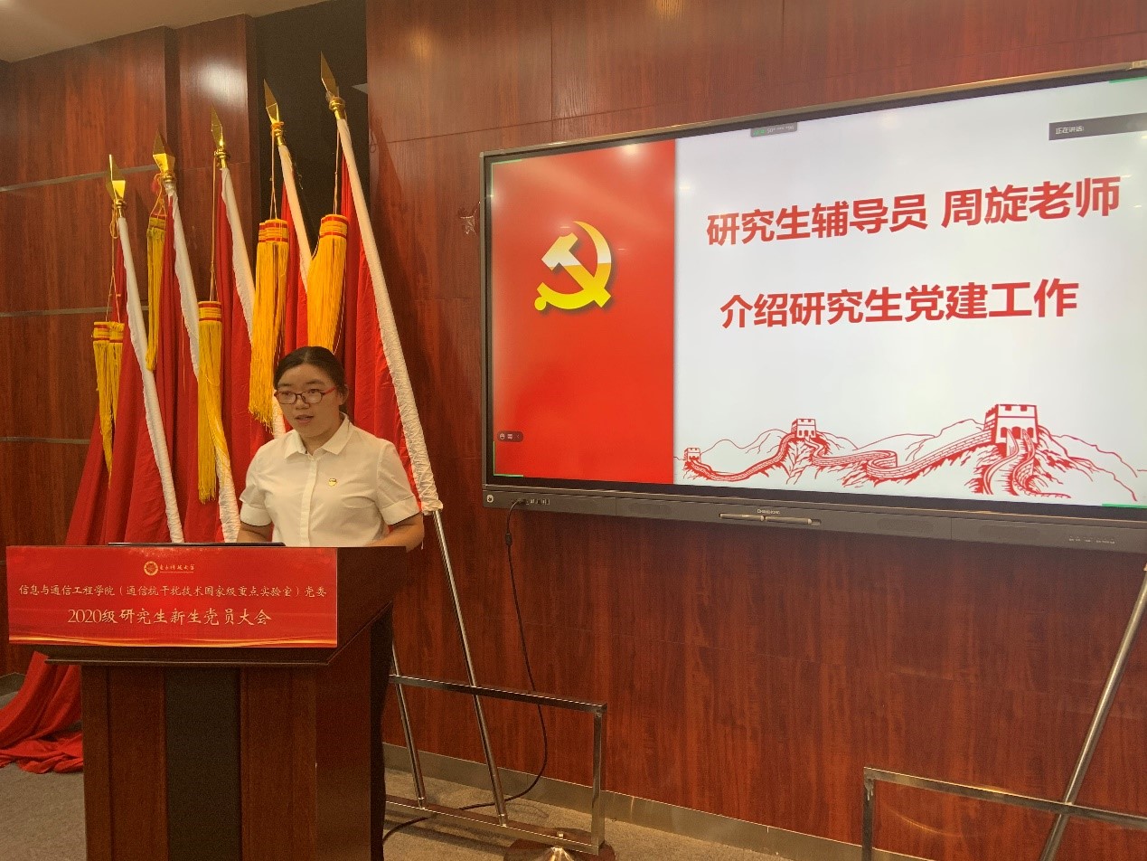 辅导员周旋从研究生党支部组织架构、党支部管理建设以及相关通知三方面详细地为新生党员介绍了党委研究生党建工作。她希望新生党员们能在支部活动中加强思想建设、在交流反思中磨练专业技能,做一名又红又专的青年党员。