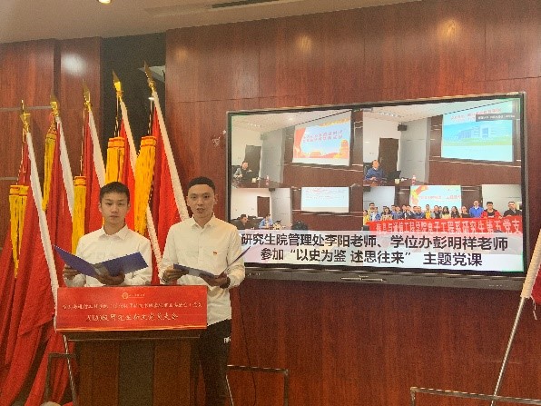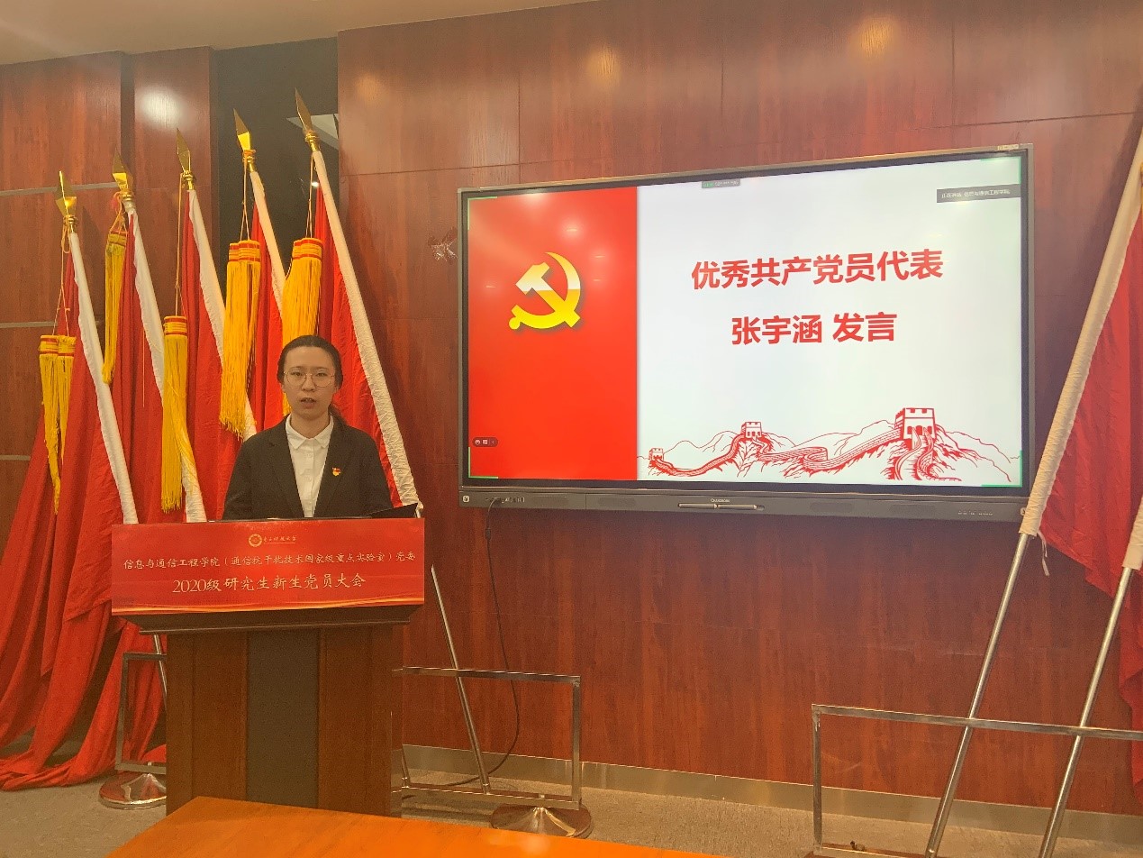 优秀党员代表张宇涵分享了她作为一名共产党员对党建工作的理解。她认为研究生党建委员会是个互通有无的交流平台、是一个与企业共建的沟通渠道、是一个追寻红色记忆的实践机会。各位新生党员作为实现中国梦接力奋斗中的一棒,应当选择投身这个波澜壮阔的时代,用坚定的初心造就自己滚烫的人生。