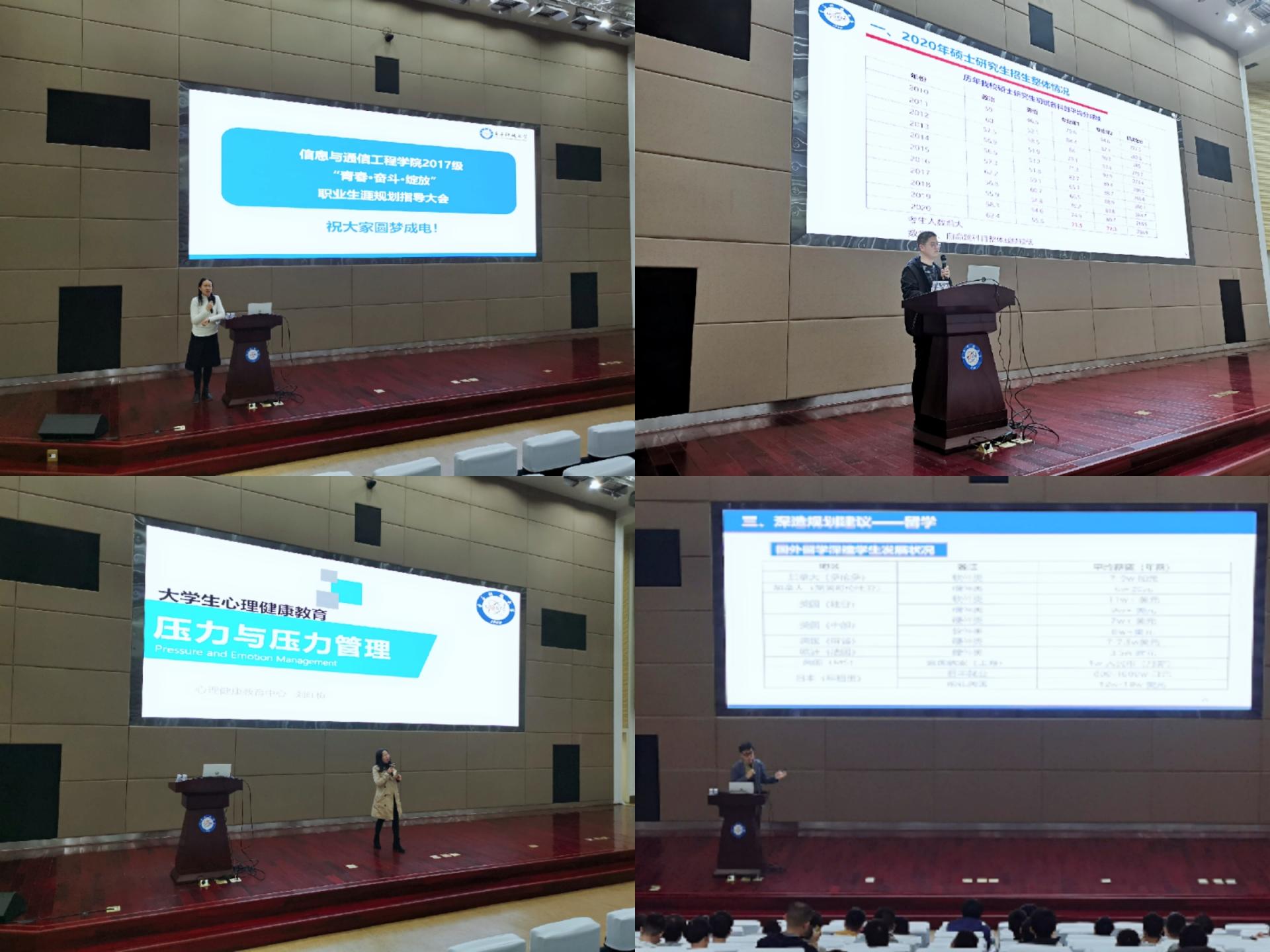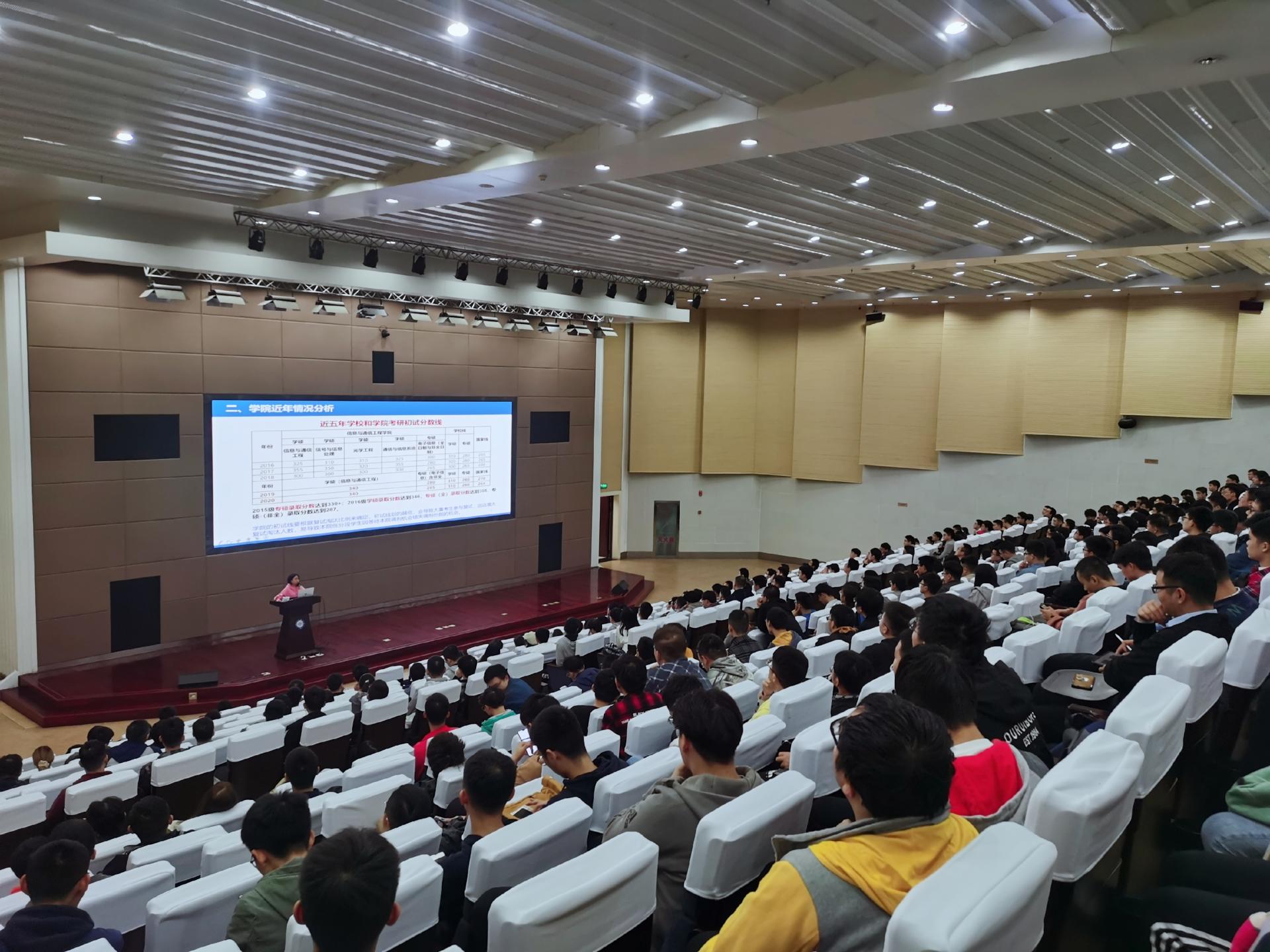 10月26日,太阳成集团tyc151cc在图书馆求实厅召开了本科2017级“青春•奋斗•绽放”职业生涯规划指导大会。公司党委副书记杨晓玲、公司研招办闫永帅老师、心理中心刘红梅老师、年级辅导员和360余名考研同学参与了本次大会。大会分别就考研深造建议、招生政策解读和考研过程中心理调适等方面给同学们进行了详细指导。