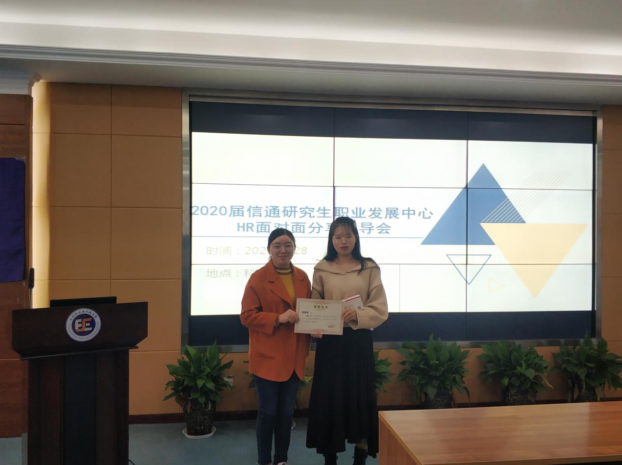 会议第二项议程为信通研究生职业发展中心“每月之星”颁奖仪式。在十月份的工作中云联部的朱甜甜同学工作积极、表现突出,被评选为“十月之星”。周旋老师为朱甜甜颁发证书并表示祝贺。朱甜甜同学向大家分享了在工作中的经验,并表示在日后将继续努力完成本职工作。