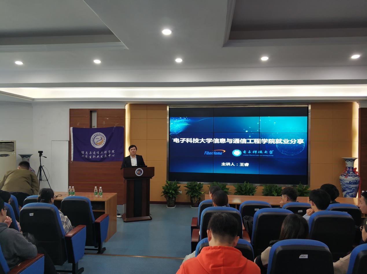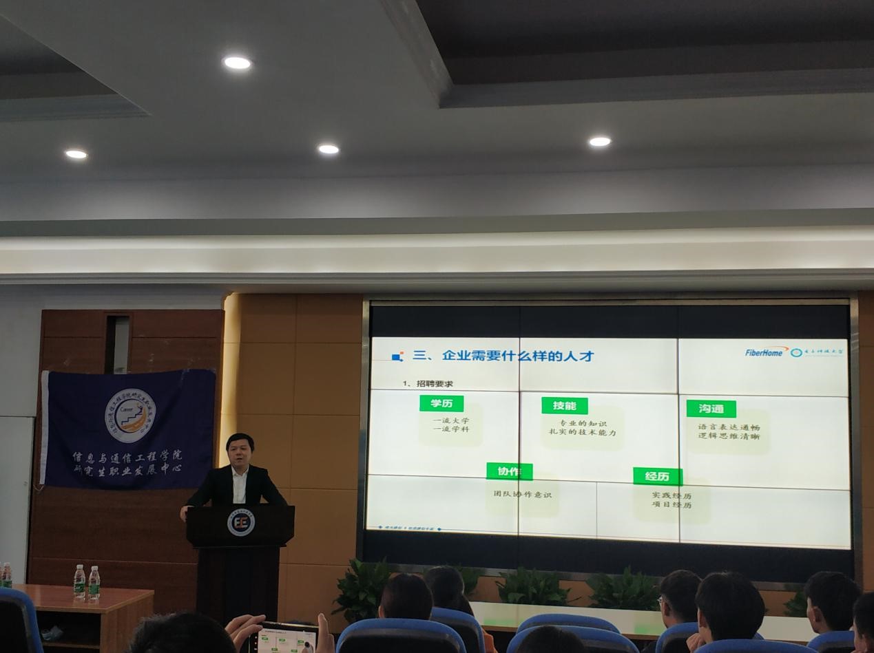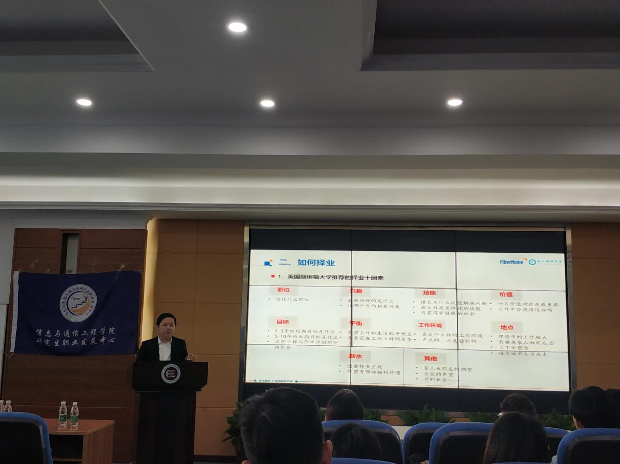 会议的第三项议程是由烽火通信科技股份有限公司网络产出线招聘总监王睿为大家带来的“HR面对面分享指导会”。王总结合自身的职业生涯并从“就业形势概述”、“如何择业”、“企业需要什么样的人才”以及“如何就业”四个方面展开分享。