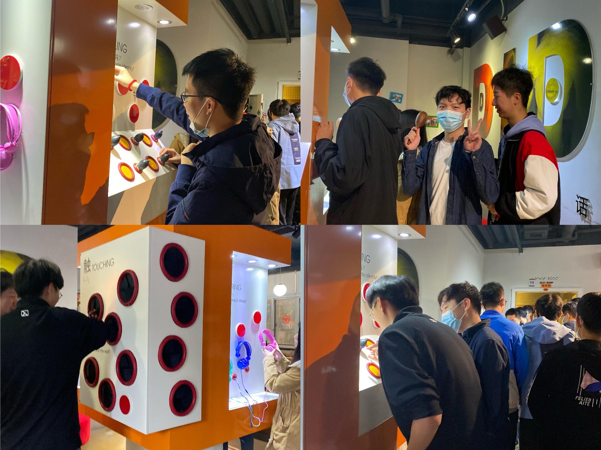 整个体验从潺潺流水、清脆的鸟鸣声和脚下的石子路开始,在导赏员的引导下同学们结伴走过了小桥,来到了一座亭子旁,还体验了青铜文物的触感。穿过公园就来到了百货商店,此刻同学们没有了刚进入黑暗环境的紧张与踟蹰,大家都踊跃地用触觉来分辨那些水果、蔬菜、玩具还有杂货的种类。接下来是过马路,与国内大多数红绿灯形成对比的是,这里的红绿灯用节奏不同的滴滴声来警示着驻足的盲人,为他们提供便利。同学们通过马路就来到了茶馆,在这里通过嗅觉来辨识了不同的物体。体验的最后,同学们围坐在沙发上分享了自己的感受,有的同学感慨视障人士生活的不易,有的同学对黑暗中同伴的帮助表示感谢,但最令大家震撼的是“黑暗中对话”全球的导赏员都是由一些视力有障碍的人来担任的。