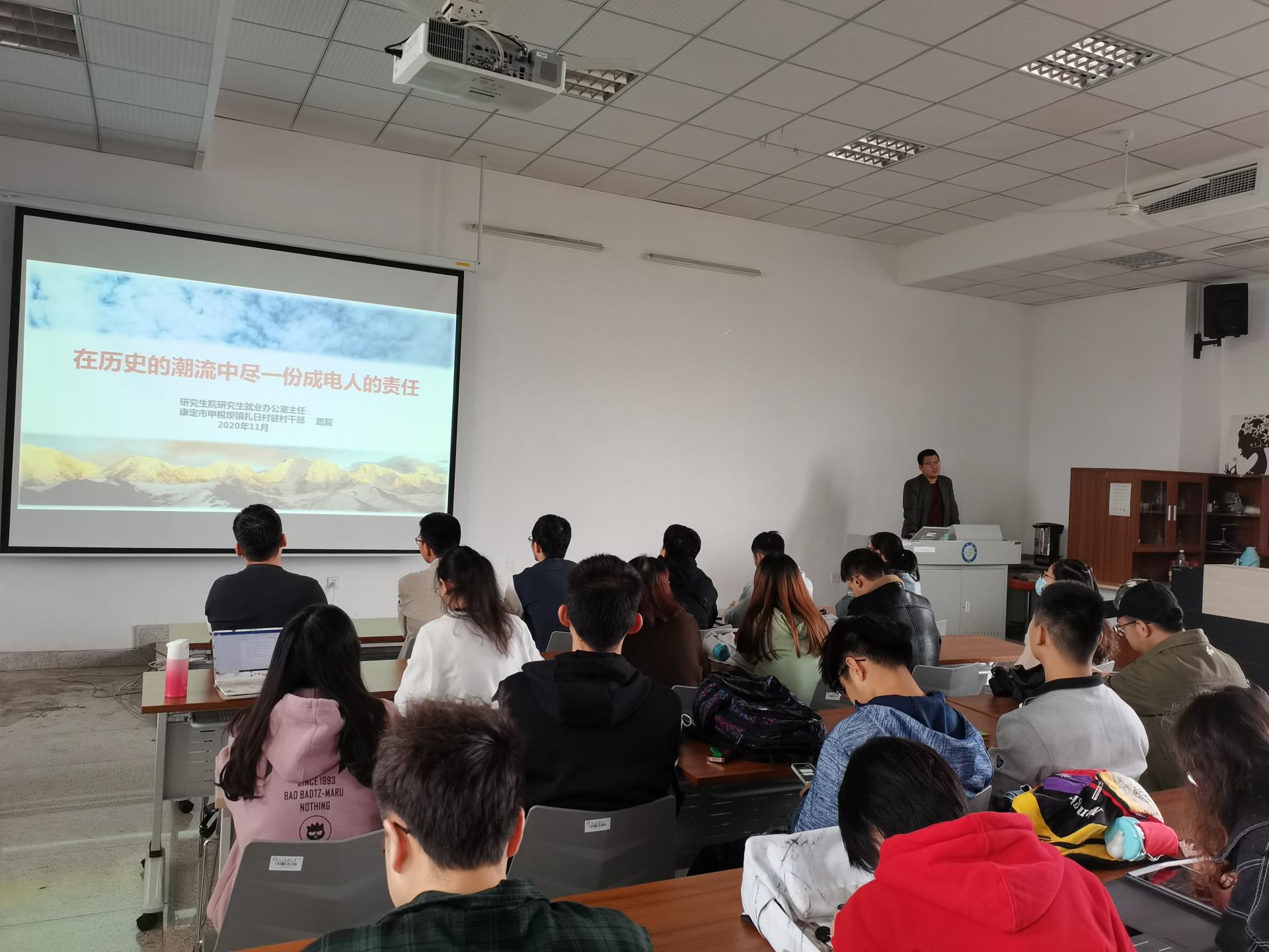 2020年11月10日,太阳成集团tyc151cc(通信抗干扰技术国家级重点实验室)党委于立人楼A415开展本学期第二次党支部书记培训活动。由研究生院研究生就业办公室主任、康定市甲根坝镇扎日村驻村扶贫干部路超老师为支部书记们带来以“在历史的潮流中尽一份成电人的责任”为主题的脱贫攻坚工作分享。