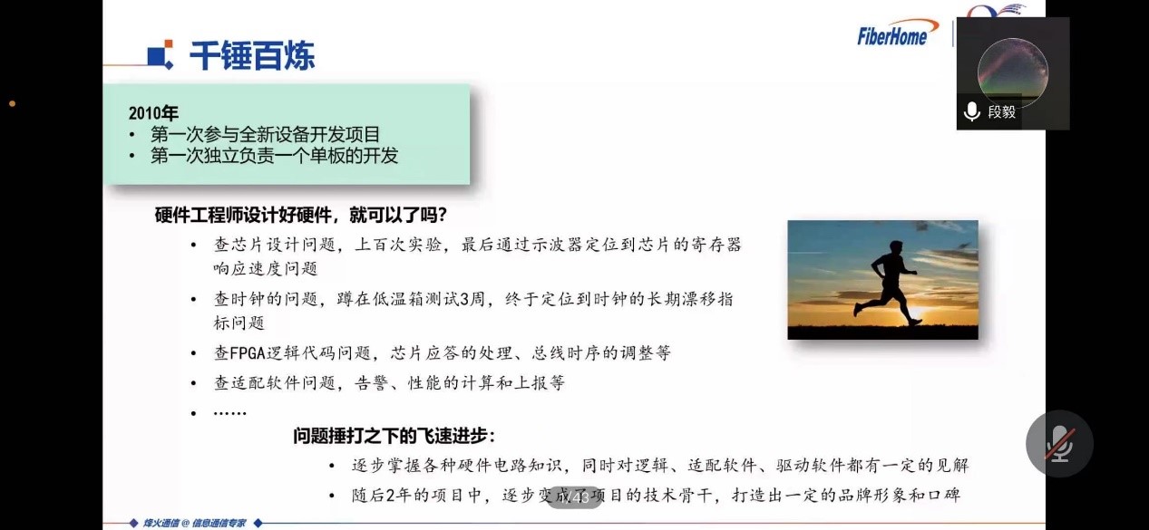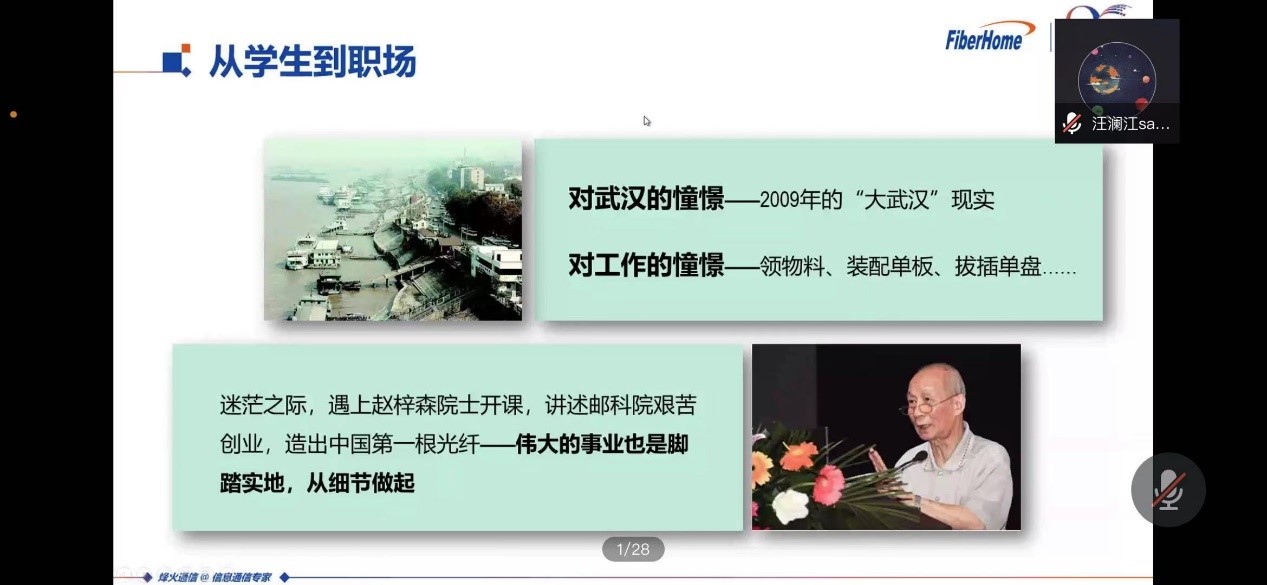 首先,段学长回忆了他在员工时期的点点滴滴,他对工作的憧憬,对武汉的憧憬。在他迷茫之际,遇上赵梓森院士开课,讲述邮科院艰苦创业,造出中国第一根光纤的故事。那时他便明白,伟大的事业也是脚踏实地,从细节做起。