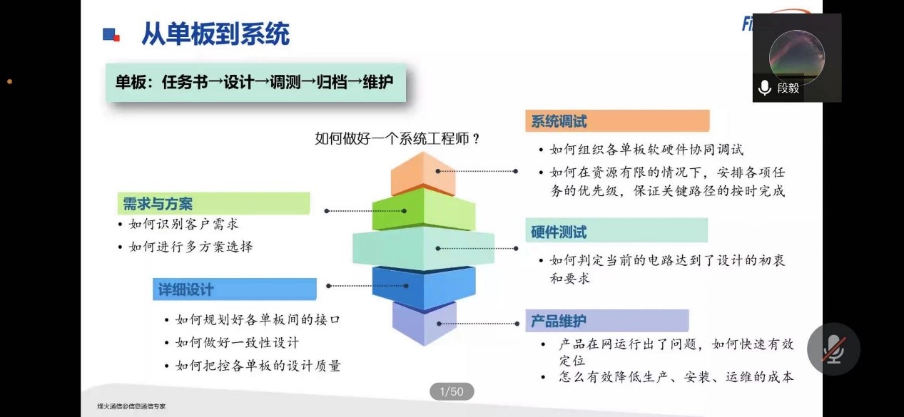 分享完自己的经历之后,学长讲述了一些关于如何做好一个系统工程师的想法,在自己的专业领域进行分享。然后讲述了自己是怎么走上技术管理,怎么将个人的成功案例进行复制,提升整个部门的设计质量和效率。