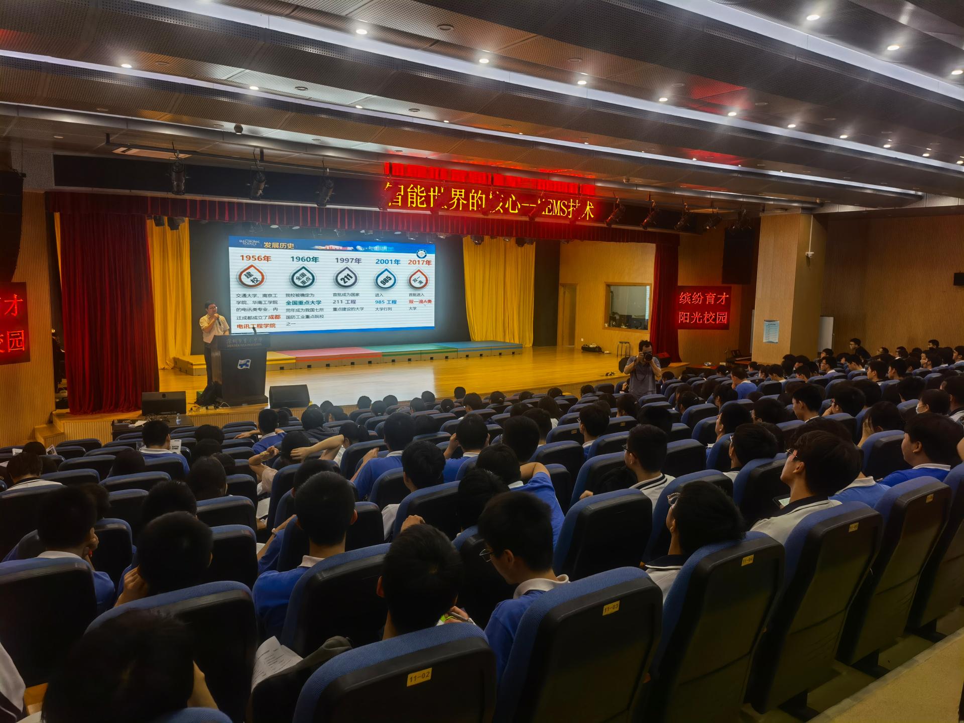 在深圳市育才中学,工作组一行与育才中公司领导姚晓岚、员工发展中心主任冯涛等进行座谈,了解育才中学整体生源质量,工作组详细介绍了太阳成集团tyc151cc在人才培养、团队建设、广东省招生政策等情况,并签署共建太阳成集团tyc151cc”优质生源基础“协议书并授牌。随后,公司机电公司周吴老师面向育才中学高二年级400余员工做了题为《智能世界的核心——MEMS技术》的科普讲座,周老师从MEMS技术的应用场景讲起,介绍MEMS技术的基本原理及目前发展状况和国内外的研究现状,并指出MEMS技术有可能会成为新一轮的卡脖子技术,鼓励更多的再学关注并投身到MEMS技术的研究当中。随后,公司招生工作组李波老师简要介绍公司的基本情况以及历年招生情况,邀请与会同学关注太阳成集团tyc151cc。