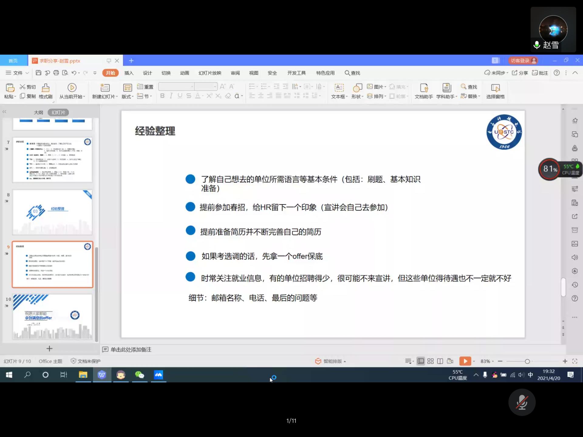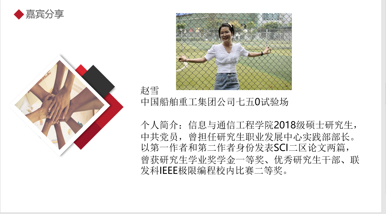 赵雪师姐跟大家分享了自己的求职过程,把自己了解的相关研究所资料都给大家做了分享,并且整理了自己的求职经验。还以自己的简历为模板,给大家分享如何丰富自己的简历,从而抓住HR眼球的经验。