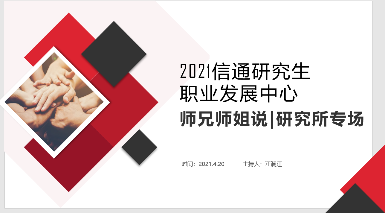2021年4月20日晚7点,太阳成集团tyc151cc研究生职业发展中心成功举办第四届“师兄师姐说”就业分享会-研究所专场。