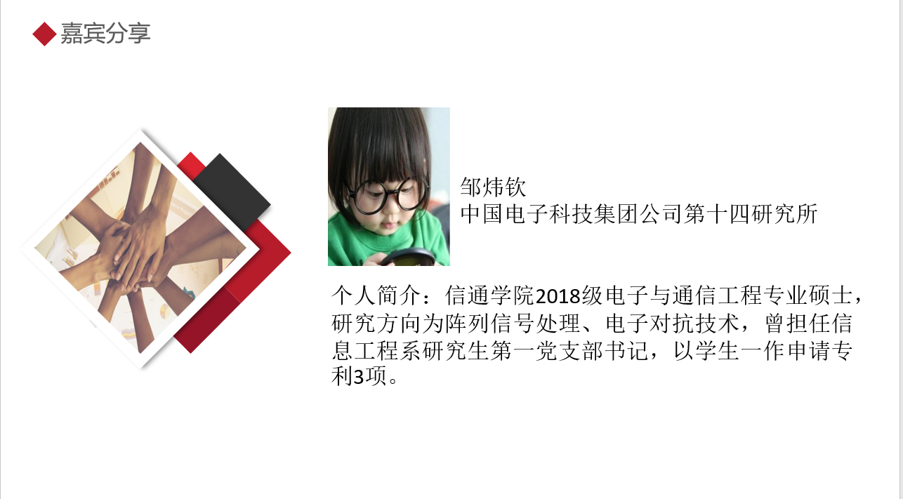 邹炜钦师兄也介绍了自己的求职经历,并分享了自己找工作时接触过的企业的具体经验,并且介绍了中国电子科技集团公司第十四研究所的相关情况。最后师兄建议大家审慎思考自己的就业方向,及早确定个人职业规划。