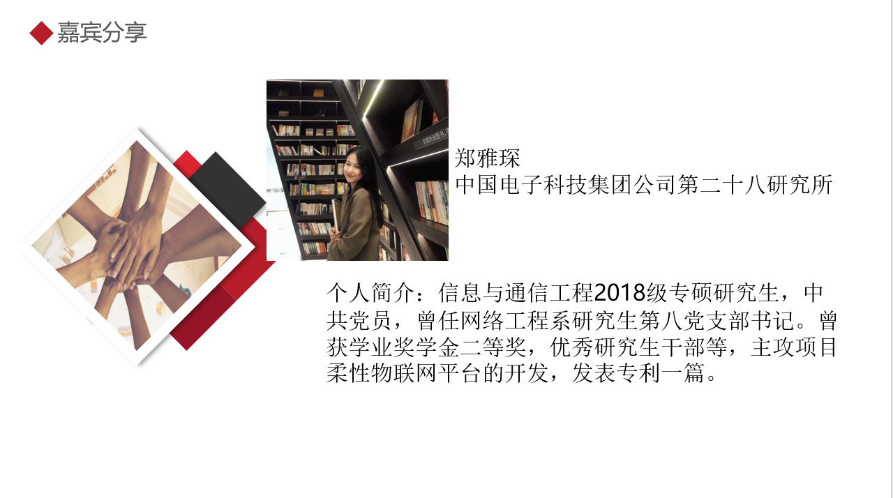 本场分享会有幸邀请到4位优秀的师兄师姐,他们分别是签约中国电子科技集团公司第二十八研究所的常聪聪师兄,签约中国船舶重工集团公司七五零试验场的赵雪师姐,签约中国电子科技集团公司第十四研究所的邹炜钦师兄,签约中电科新一代移动通信创新中心(上海)的郑雅琛师姐。本次分享内容主要包括如何获取招聘信息、求职历程、面试小贴士和简历建议等共计吸引200余名同学参加。