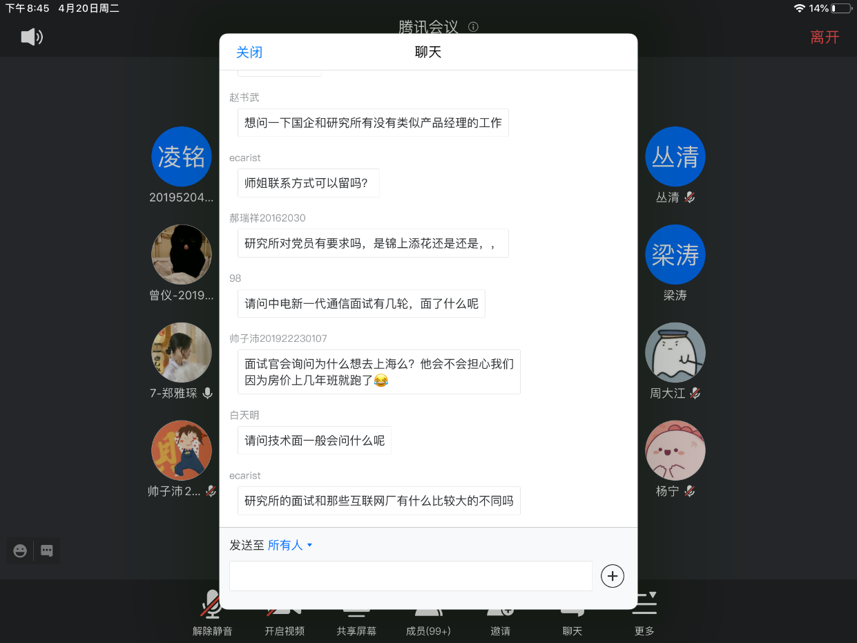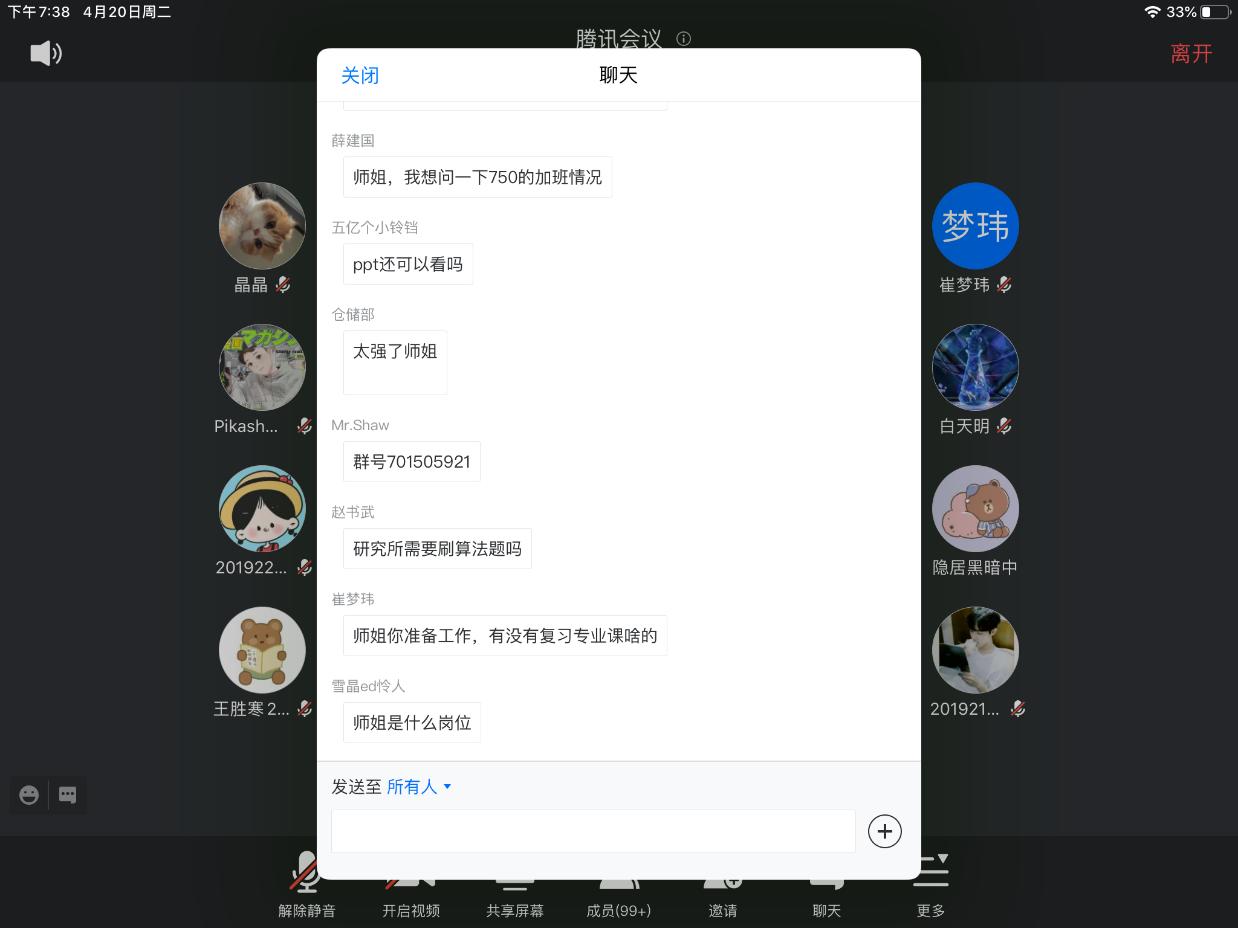 最后活动圆满结束,同学们表示收获颇丰,并且在聊天区表达了对师兄师姐们的感谢。后续研究生职业发展中心还将继续举办“师兄师姐说”其他专场活动,期待同学们踊跃参加。