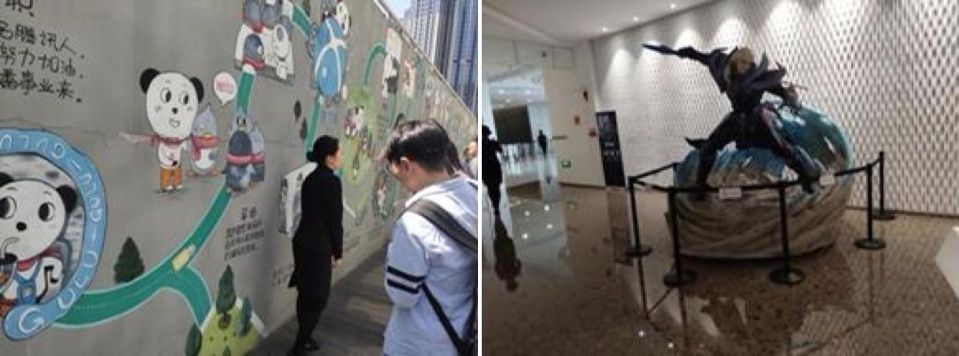 接着同学们观看了一名十年腾讯工作者所绘画的记录了十年腾讯生活的涂鸦墙。涂鸦墙通过可爱的卡通形象,展现了腾讯丰富的业余生活,还包含了腾讯的四大神兽长颈鹿、海燕、海豚和蜜蜂。