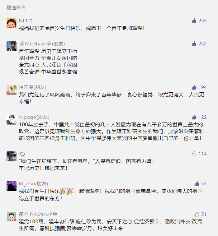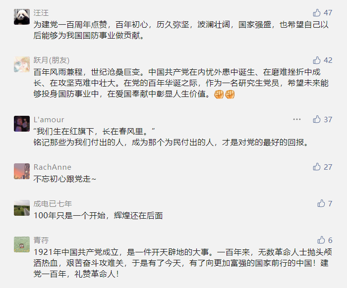 本次活动分为礼赞建党百年、HR老师介绍单位情况、互动环节和线上答题竞赛四个环节。在“礼赞建党百年”环节,同学们纷纷在本次活动的推文下为党的百年光辉历程、我国的国防建设事业送上心中最想说的话,表达最诚挚的祝福。此次点赞活动得到1100余人关注,营造了人人关注国防建设、宣传党史知识的浓厚氛围。