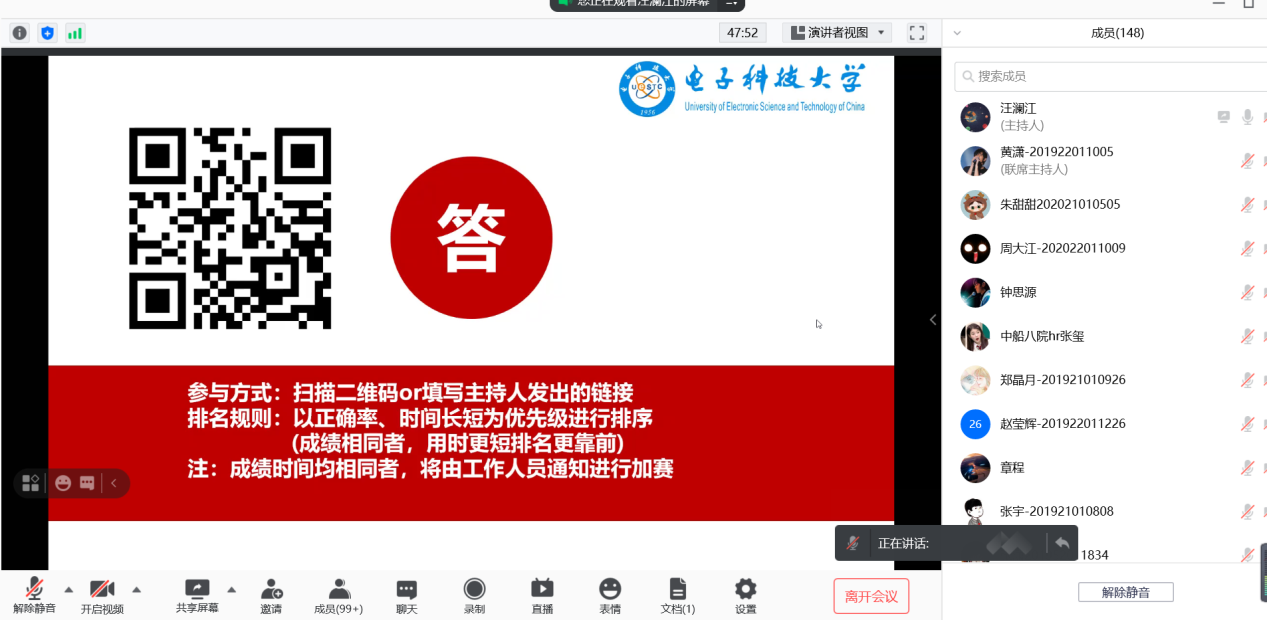 互动环节结束后为线上竞赛环节。竞赛主要围绕中国共产党党史和国防重点单位发展历程等相关知识进行。本次竞赛分成三轮进行,同学们必须在规定时间内将题目答完,以正确率、时间长短为优先级进行排序,选出一、二、三等奖获奖人员。每轮竞赛同学们都争分夺秒、自信果断、反应敏捷、镇定做题,每轮答题正确率都很高。大家都踊跃思考、冷静作答,整个线上竞赛活动在一种充满了积极向上、永不言弃的氛围中进行。同学们在你追我赶的气氛中不断深化学习,不断增强党史知识的储备,不断加深自己对于国防事业单位的认知与理解,不断坚定科技强国的理想信念。