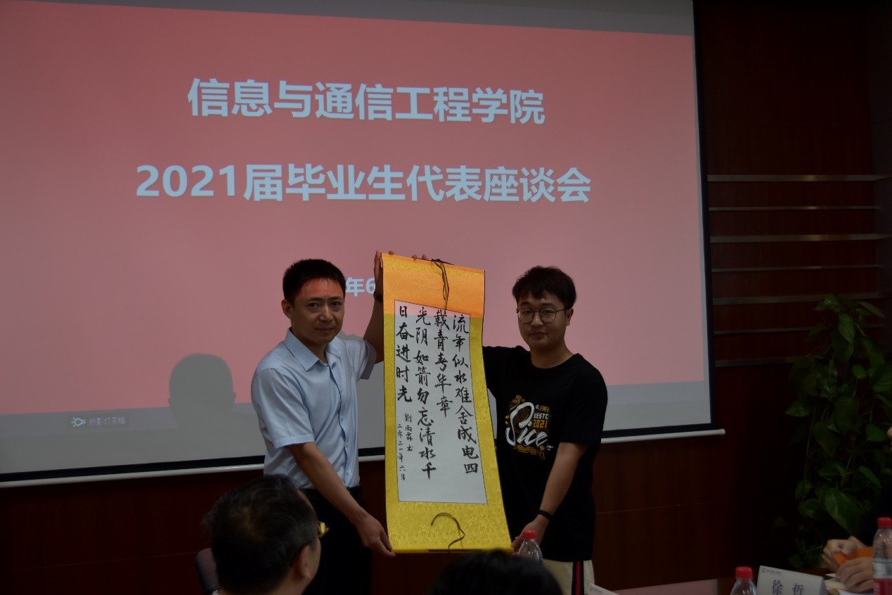 公司2017级本科生刘雨霖为公司赠送了一幅书法作品,“流年似水难舍成电四载青春华章,光阴如箭勿忘清水千日奋进时光”。刘雨霖同学表达了对在成电四年青春年华的不舍,难忘在清水河校区近千日刻苦奋斗的时光。公司也为在场的每位毕业生赠予了纪念文创用品作为毕业礼物。