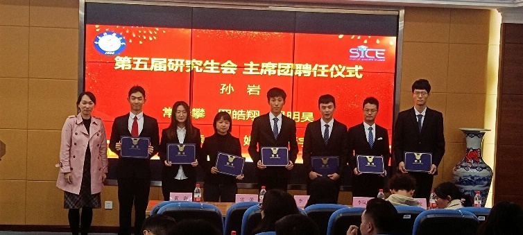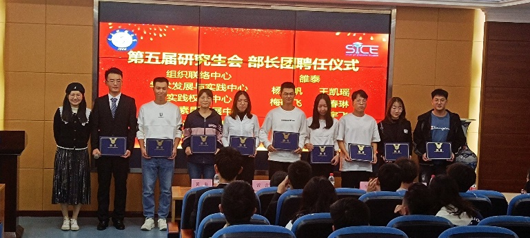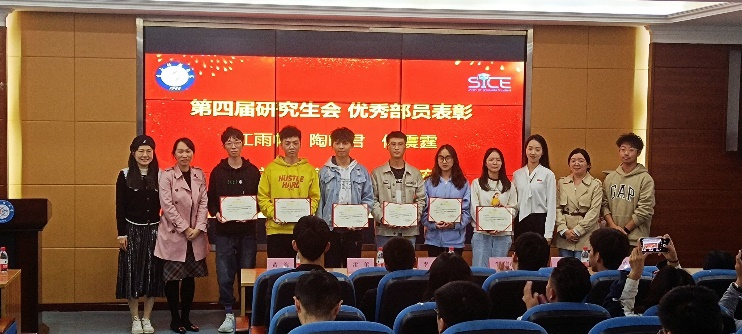 大会第三项,雷蕾老师、李娜老师以及第四届信通研会主席李嘉欣为第四届研究生会优秀部员进行表彰、颁发证书;为新一届研会主席团及各部门负责人颁发聘书。