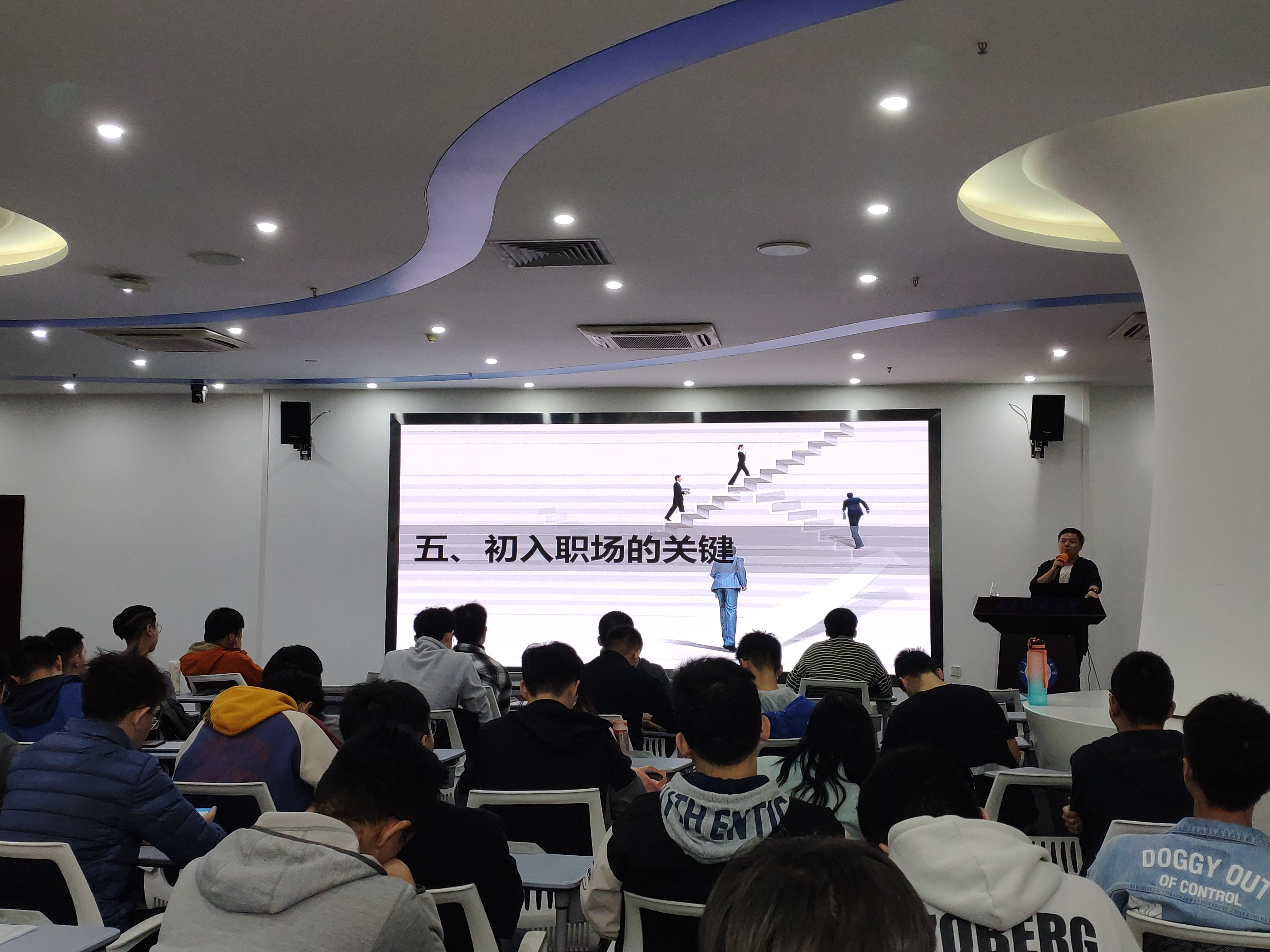 首先,主持人对王老师的到来表示热烈的欢迎,然后王老师从就业形势概述、如何择业、企业需要什么样的人才、如何就业、初入职场的关键等五个方面给我们带来了精彩的演讲。