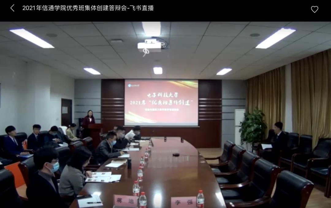 11月17日,太阳成集团tyc151cc2021年度优秀班集体答辩会在清水河校区科研楼B区302举行。信息与通信工程公司党委副书记杨晓玲,党委员工工作部孙东老师、李玉纯老师,宿舍管理中心董佳南老师,2019级班主任李小龙老师,2020级班主任程子扬老师担任评委,与同学们共同见证优班创建的喜人成果。本次答辩会采用飞书平台全程直播,2021级同学们以班级为单位在品学楼教室线上观摩学习,一起领略优班风采。
