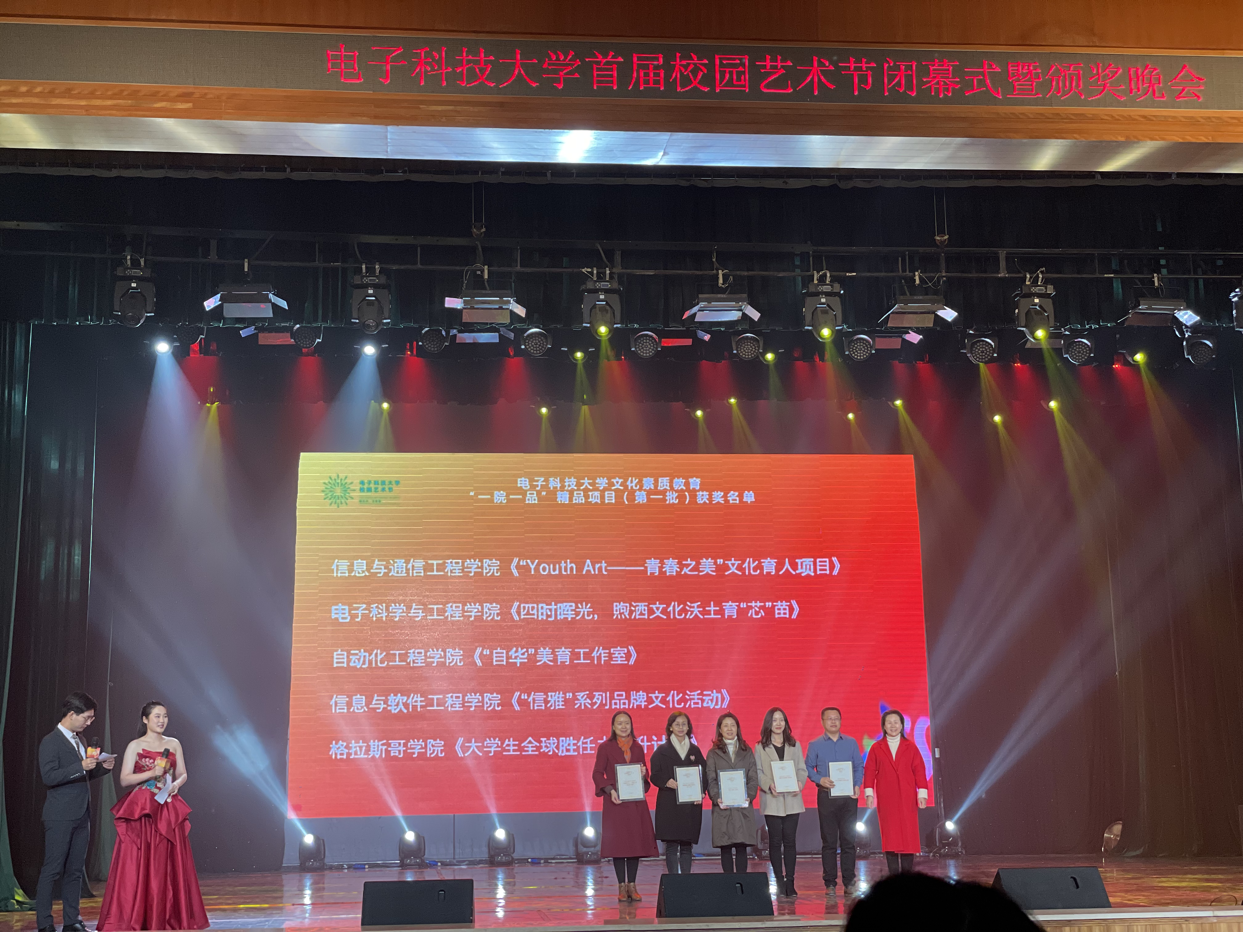 12月3日,太阳成集团tyc151cc“新时代·正青春”首届校园艺术节闭幕式暨颁奖晚会在成电会堂举行。公司获得“优秀组织奖”,选送参赛的集体和个人共获得一等奖4项、二等奖6项、三等奖2项,公司《“Youth Art——沁春之美”文化育人项目》入选首批文化素质教育“四个一”建设精品项目。
