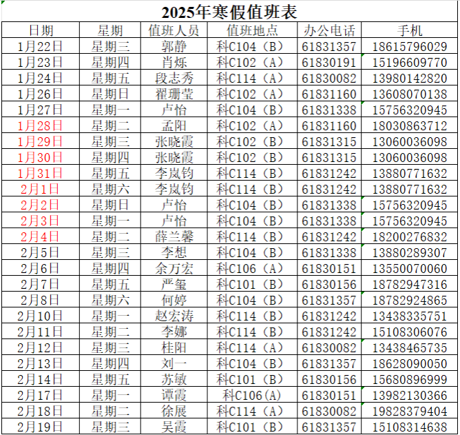 寒假期间,院领导带班、机关各科室轮流值班。具体值班安排及要求如下: