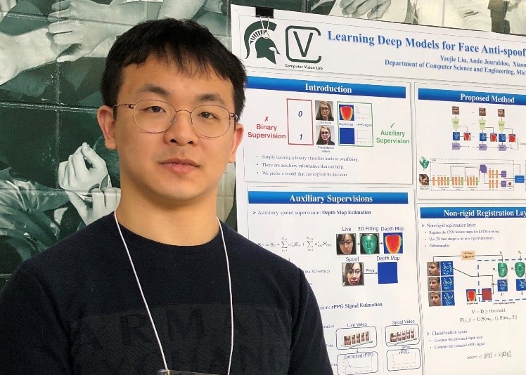 Yaojie Liu is a fourth-year Ph.D. student and research assistant at Michigan State University in the Computer Vision Lab (CVLab), advised by Prof. Xiaoming Liu. Before joining MSU, he obtained his B.Eng. degree from University of Electronic Science and Technology of China at 2014 and M.Sc. degree from the Ohio State University at 2016. From 2015 to 2016, he was a member of Computational Biology and Cognitive Science Lab (CBCSL), working with Prof. Aleix Martinez. In 2019 summer, he joined Apple AI Research as an intern, working with Dr. Barry Theobald on audio visual modeling. He serves as the reviewer of many international journals and conferences, such as TIP, Neurocomputing, CVPR, AAAI, ICCV, and ECCV. He has one U.S. patent on file.