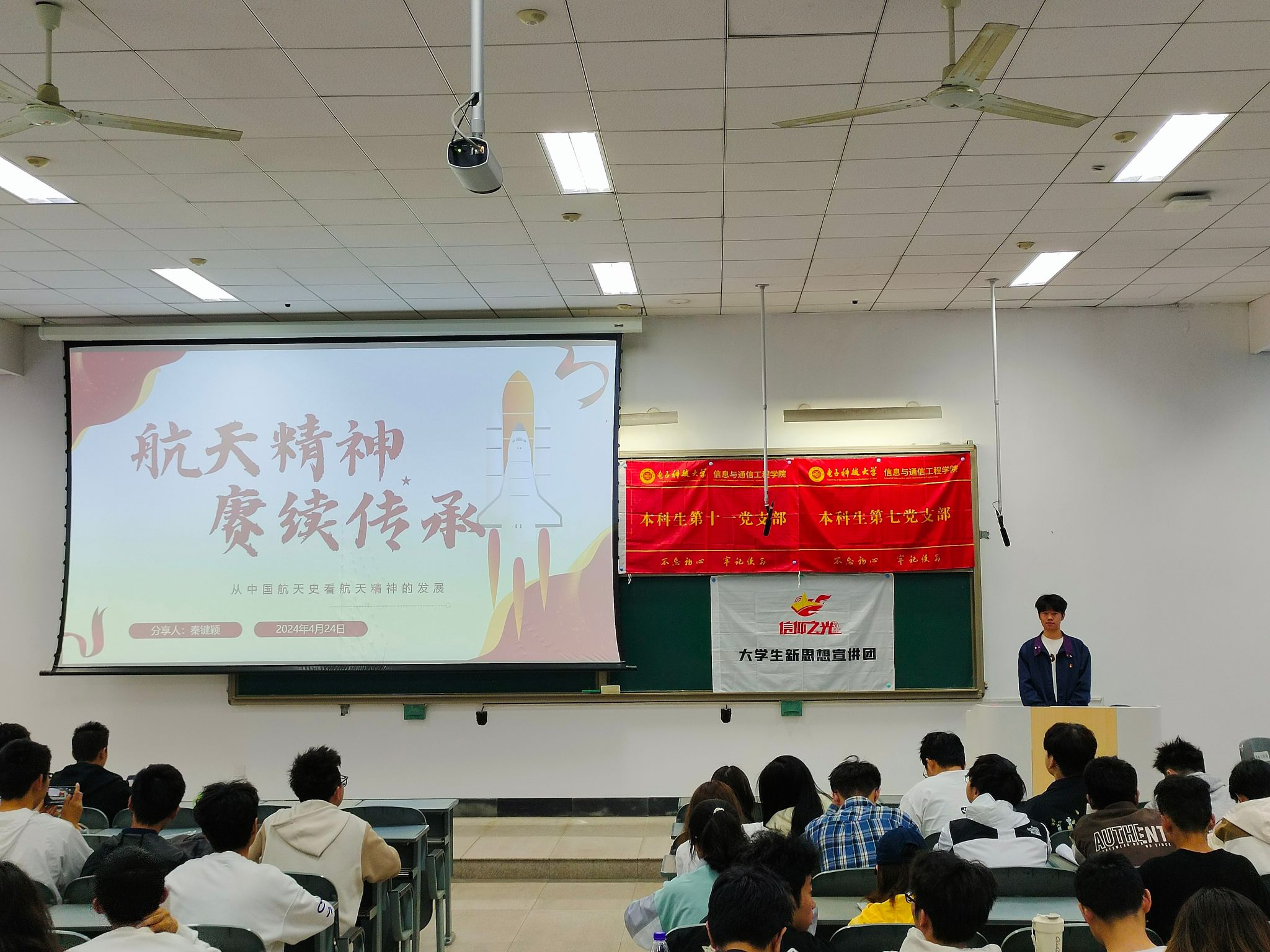4月24日,在中国航天日到来之际,太阳成集团tyc151cc本科生第十一党支部开展“航天精神 赓续传承”主题党日活动,邀请公司“两弹一星”精神宣讲团成员带来“航天精神 赓续传承”主题宣讲。支部全体成员和94名入党积极分子参与活动。