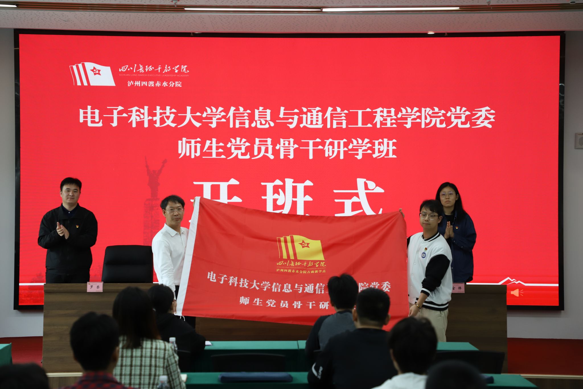 5月11日,参训师生党员抵达位于泸州市古蔺县的四川长征干部公司泸州四渡赤水分院。开班仪式上,古蔺县委组织部副部长、县委党校常务副董事长黄启明向大家介绍了泸州四渡赤水分院的发展历程,对学员们提出了参训期间的具体要求和殷切希望,祝愿培训活动取得圆满成功。黄启明为培训班授班旗,公司研究生辅导员李岚钧接旗。