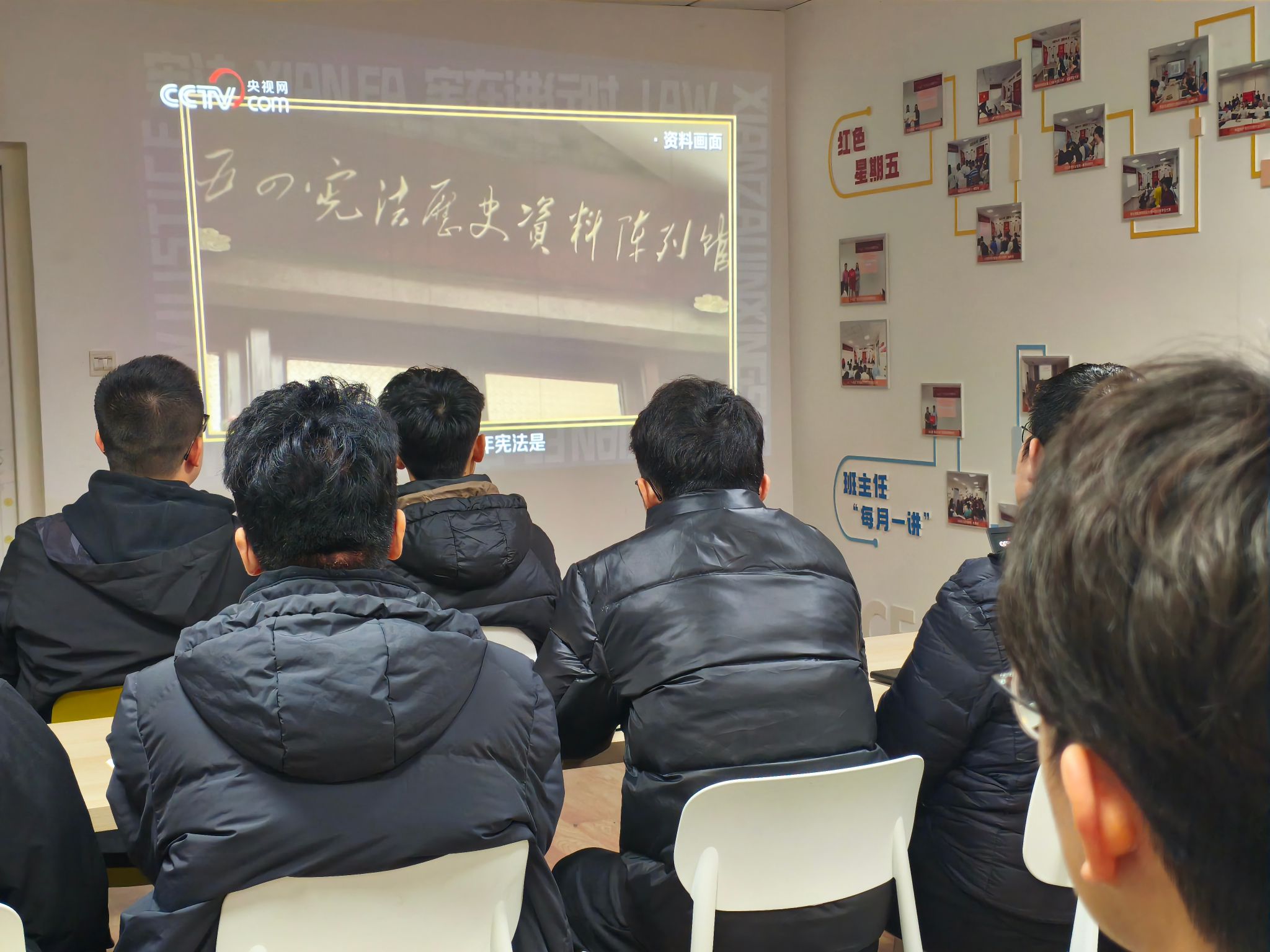 活动伊始,辅导员罗荣老师和支部书记葛崇淋老师向支部党员介绍了宪法的重要性和核心内容,强调宪法作为国家的根本法,是治国安邦的总章程,并鼓励大家利用线上线下学习资源,更加深入全面地了解和学习宪法精神。随后,支部成员观看了央视网发布的“良法善治 同心同行|讲述宪法背后的故事”视频,通过讲述宪法背后的故事来强调宪法在国家治理中的重要性地位。视频还强调了优良法律和有效治理的重要性,并鼓励全社会共同参与宪法的学习和实践,以增强公众对宪法精神的理解与认识,共同维护宪法权威,推动法治社会建设。