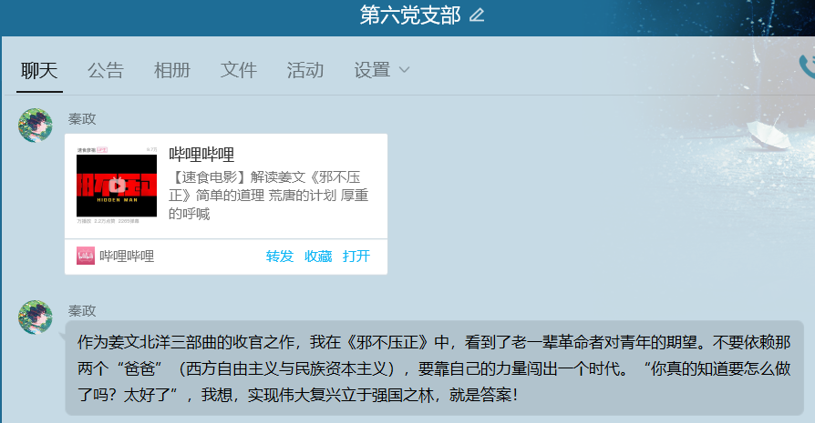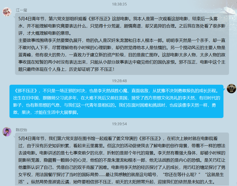四月以来,图书馆开设了“初心影院”观影活动。第六党组织党员同学于“五四”青年节的下午,一起在图书馆观影厅观看《邪不压正》这部电影。这部电影情节紧凑,内涵丰富。观影后,秦政同学在支部交流群内分享了一个解析视频,并表达了自己对这部电影的理解,其他同学也陆续分享了自己的感想,在支部内展开了热烈讨论。