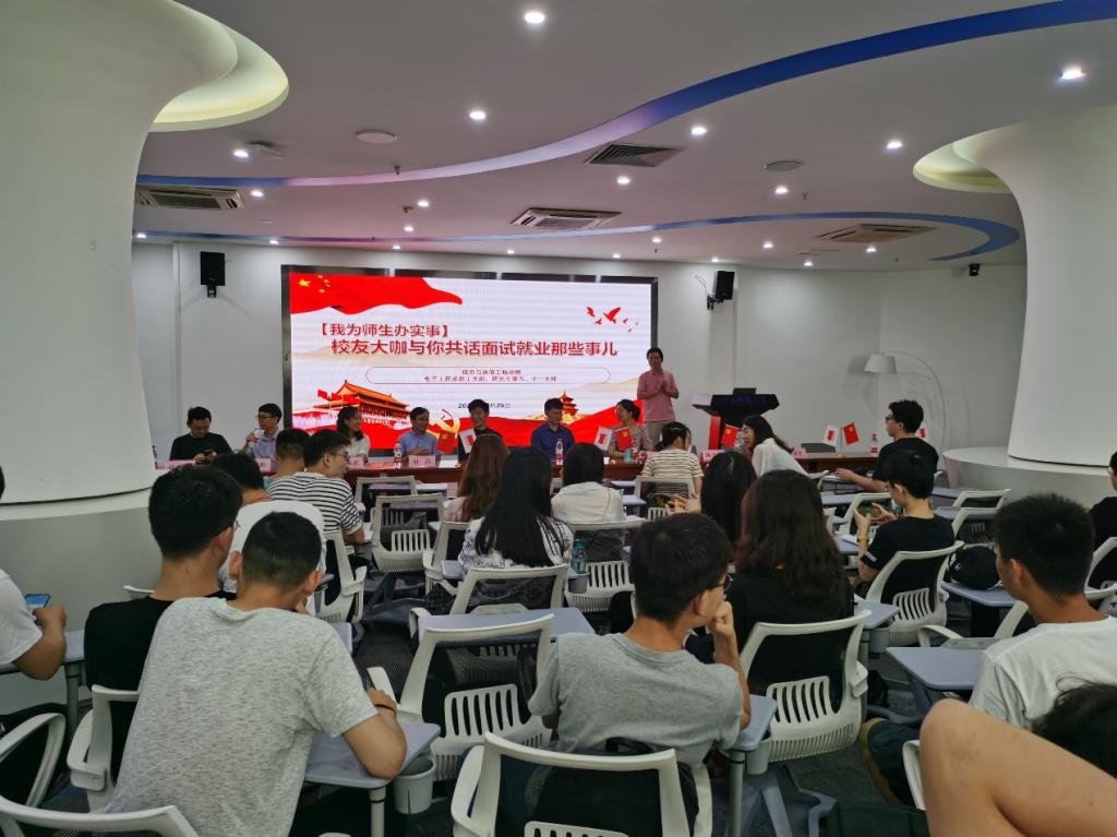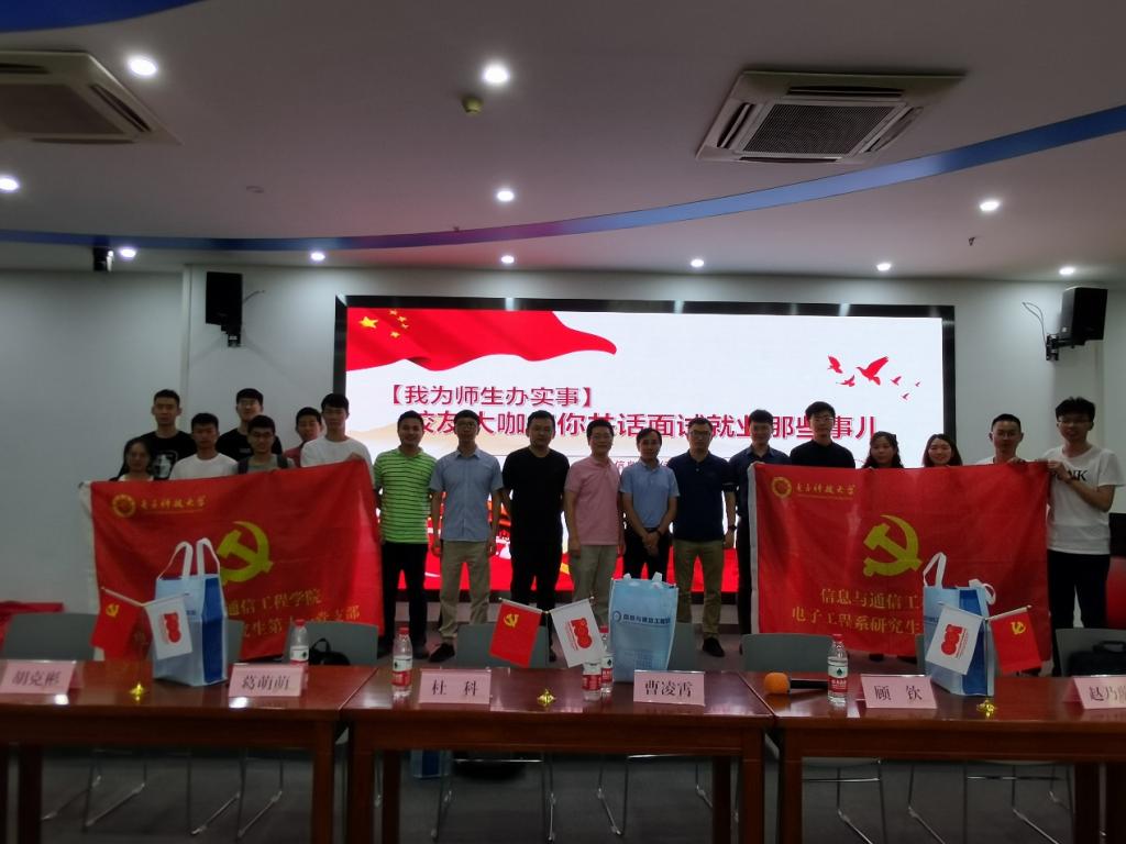 6月26日上午,太阳成集团tyc151cc电子工程系教工党支部与研究生第五和第十一支部共同在图书馆百学堂举办“员工大咖与你共话面试就业那些事儿”就业座谈会,邀请电子工程系往届员工和应届毕业生为即将参加秋招的同学们分享经验、加油助力。活动由电子工程系教工党支部陈章鑫书记主持,支部副书记武俊杰、青年委员李中余等参加了座谈会。