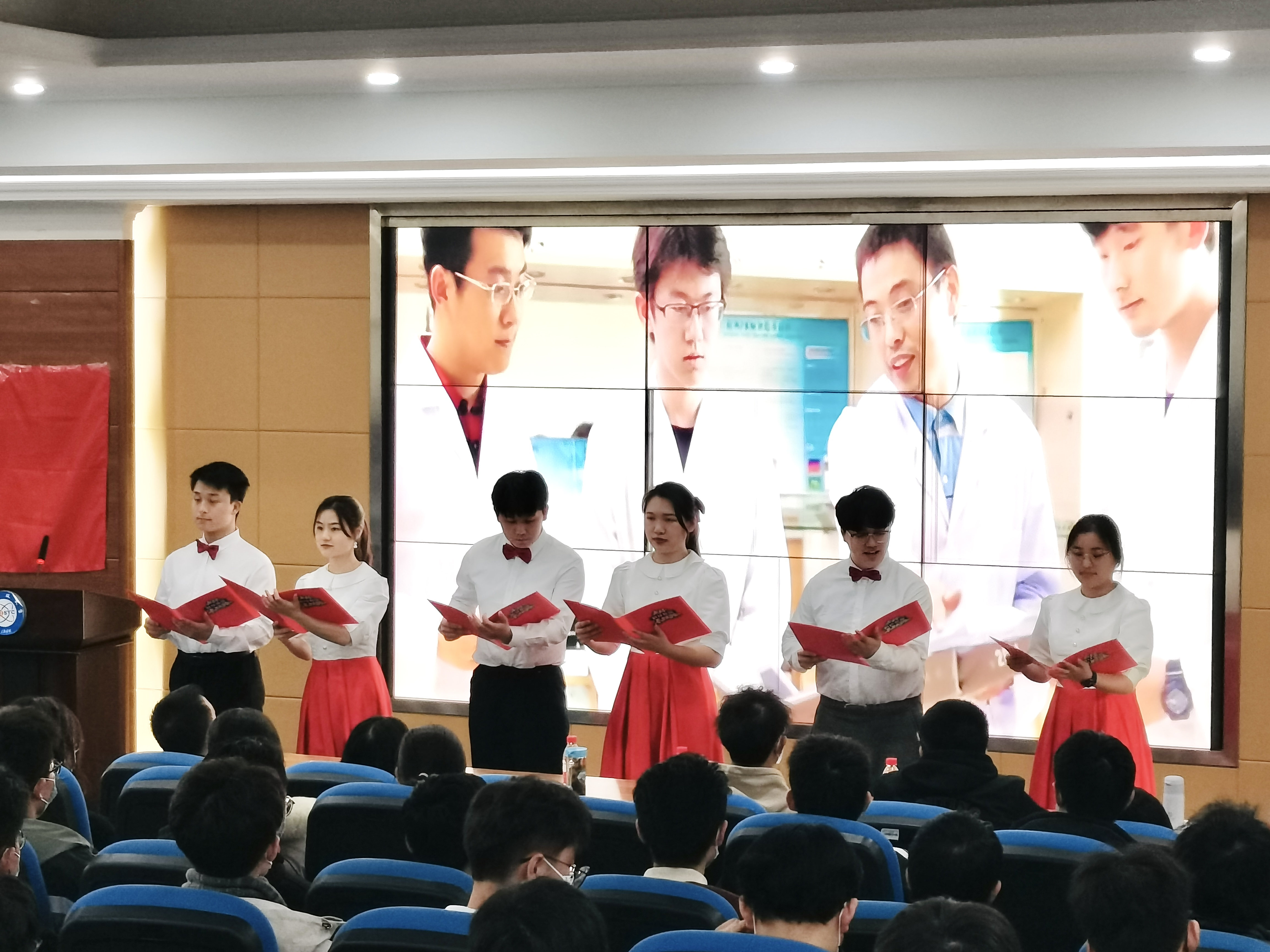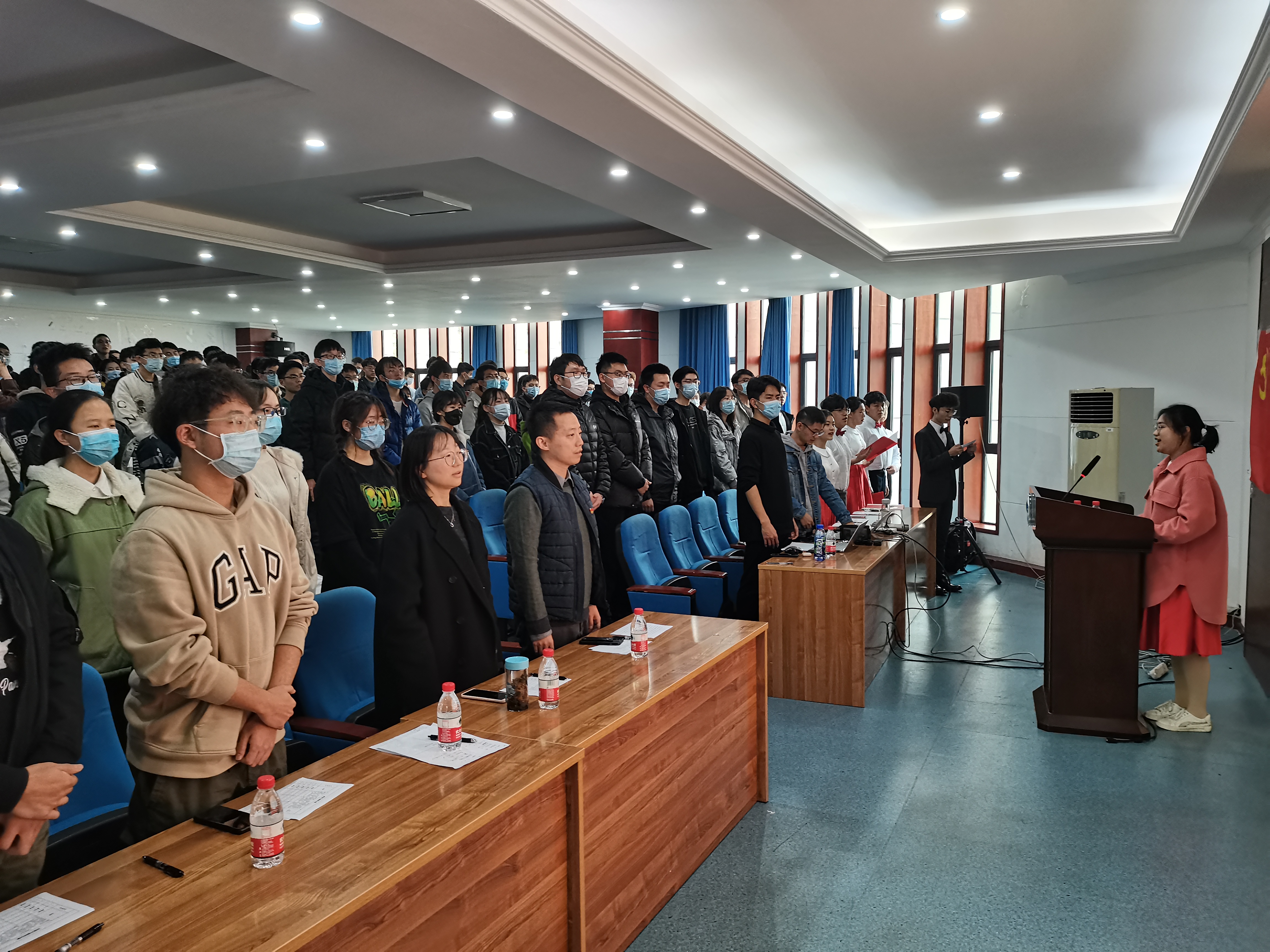 比赛开始前,“5月的向日葵”辅导员工作室下属“星光”老员工红色文化原创剧社成员赵可欣带领全体发展对象共同唱响《国际歌》,庄严的旋律回荡在整个会场。