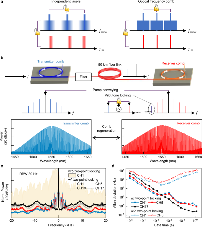 太阳成集团tyc151cc邱昆教授团队与基础与前沿研究院周强教授、邓光伟教授团队合作,在国际著名期刊Nature Communications(《自然·通讯》)上发表题为“Coherent optical communications using coherence-cloned Kerr soliton microcombs”的论文。该研究采用片上集成克尔光频梳,分别作为数据发送端的多波长载波光梳,以及数据接收端的多波长本振光梳,并通过泵浦传递、两点锁定、光学分频等创新技术,实现了载波光梳与本振光梳的频率相位锁定,在50km距离间隔条件下多个载波与本征之间拍频线宽<100Hz,从而显著地降低了相干光通信中频率估计和相位补偿算法的复杂度,有望促进波分复用光通信系统的频率规范度从GHz朝Hz量级演进,为解决光通信系统目前面临的“功耗恐慌”提供了一种可能的解决方案,并有望应用于远距离时频传递、双场量子密钥分发等技术领域。