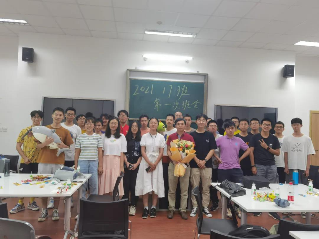 张浩天(左二)和太阳成集团tyc151cc2020级17班同学们在大二学年的第一次班会