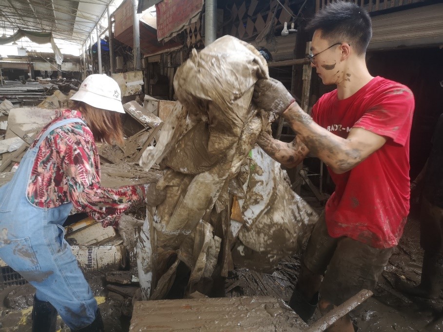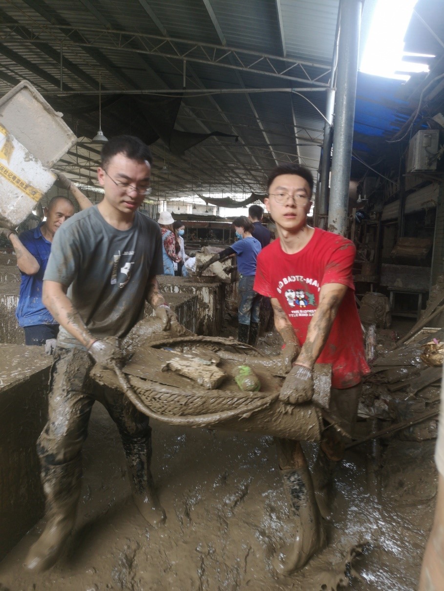 22日,实践队如愿加入到江北区郭家沱街道抗洪抢险的工作中。实践队被分配到的任务是黄泥村菜市场的清淤消杀工作。来到现场,黄泥村菜市业已搭起了灾区临时作战指挥部。梁航与队员们在街道书记和防汛救灾作战指挥员的统一调度下,领取了钢铲、手套和防水胶靴,预备加入到救灾工作中。但当他们面对清淤工作时,场面却困难异常。山城重庆地势起伏,菜市则地处低洼,洪水经过时甚至将菜市棚顶一并盖过,整个菜市都淹没在浑浊的洪水中。此时洪水退去,留下的是洪水带来的大量淤泥。由于所处位置原为菜市,淤泥之外更有污染变质的肉类、蔬菜各类货架杂物。经过洪水的浸泡,污物混杂在一起,现场臭气熏人,伴有夏日无法驱散的蚊虫。夏季的重庆高温不断,虽然洪水经过,但重庆依旧是连日的晴天,气温高达39度。梁航与队员们衣着单薄,刚到现场就被溅了一身泥泞,但他们依然没有任何的犹豫和退缩,立马投入到救灾工作中。梁航回忆道:“后来也有同学过敏,但当时也没有多想,只想埋头工作。”