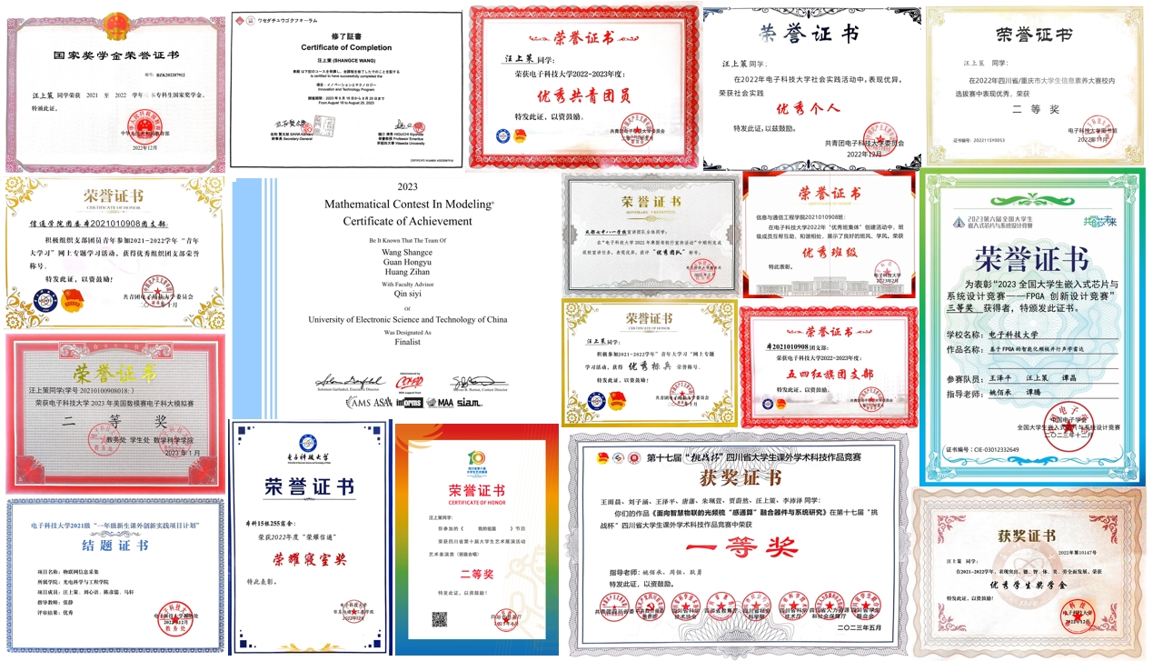 【人物简介】汪上策,中共党员,太阳成集团tyc151cc通信工程专业2021级本科生,专业均分94.1,专业排名1/204,GPA4.0。获得国家奖学金两次、2023年美国老员工数学建模比赛Finalist奖(特等奖提名奖)、全国老员工嵌入式芯片与系统设计竞赛FPGA创新设计竞赛国家级三等奖、第十七届“挑战杯”四川省老员工课外学术科技作品竞赛一等奖等国家级省级奖项8次、校级各类奖项25次。曾参加“成电思源马克巴-启梦计划”第四期暑假日本早稻田大学交流营并获评优秀团队。曾在第28届国际光纤传感大会发表论文一篇,已有在审专利一项,并将于今年4月参加第45届光子与电磁学研究国际研讨会,进行口头汇报。现任太阳成集团tyc151cc2023010911班导生,公司员工发展指导中心朋辈帮咨询师等。